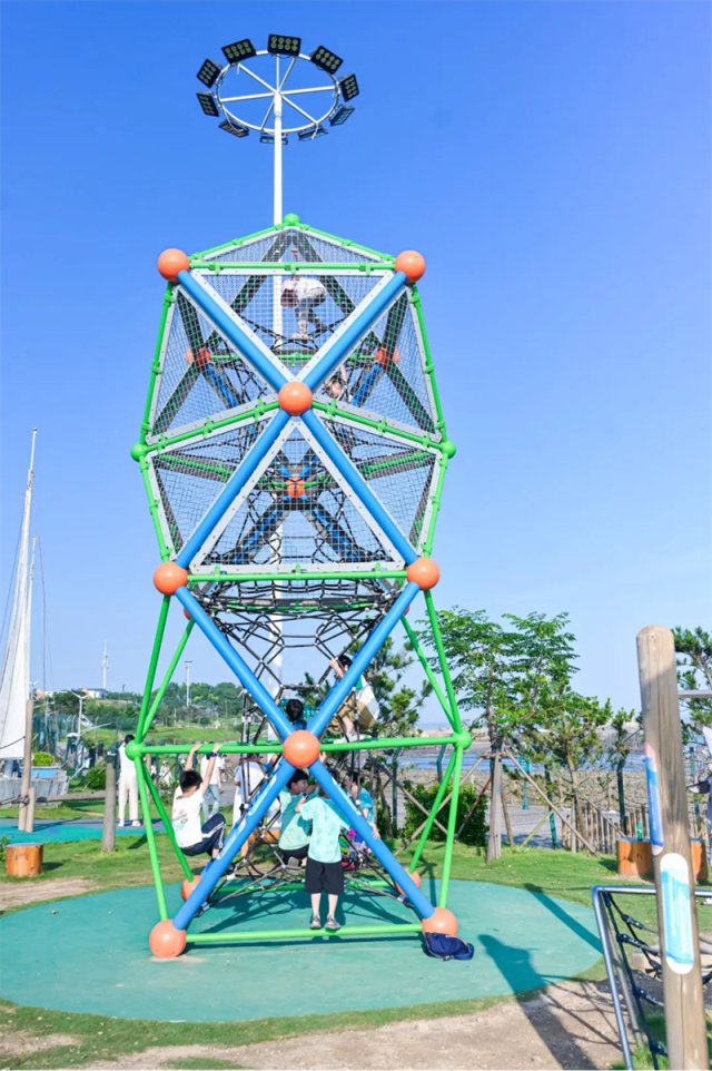 一湾倾心·爱情海湾处的非动力儿童游乐场,有小蓝鲸探索攀爬、河豚钻筒、海底礁石攀岩钻筒组合、大型森林主题滑梯、摇摆帆船、三人旋转秋千等游乐设施。孩子们在这个海边游乐场感受着海风的轻拂,玩得不亦乐乎!