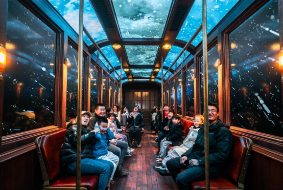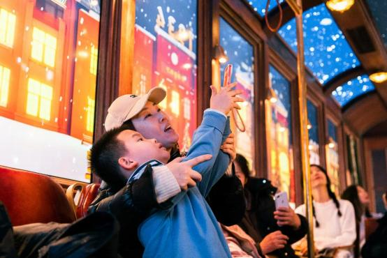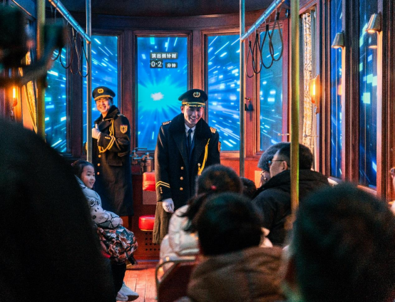 为了赋予观众更多参与感,电车内特别设置了真人演艺环节——“ 电车车长”会出现 在你的身旁,以角色叙事的方式带你融入剧情。演员们随着画面互动,惟妙惟肖地展 现青岛旧日的风情与海洋城市的热情,使观众的视觉、听觉与情感体验完美合流。