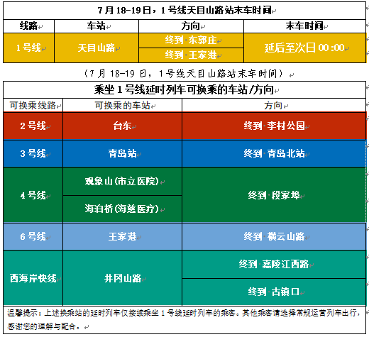 7月18—19日,地铁1号线天目山路站双向末车均延后至次日00:00,1号线延时列车途经可换乘的地铁2、3、4、6号线及西海岸快线将同步延时接续。请返程乘客务必在地铁1号线天目山路站乘车。