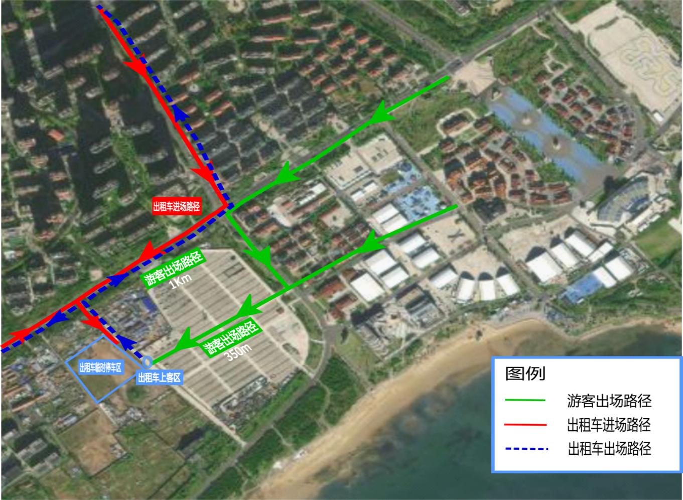 乘客乘车路线:一是啤酒节开闭幕式当天,由啤酒城西门出场,沿P1停车场内部道路西向至巡游出租车上客区。二是啤酒节其他时段,①由啤酒城主门(北大门)出场,沿金沙滩路、银沙滩路西向至巡游出租车上客区;②由啤酒城主门(北大门)出场,沿金沙滩路、连三岛路,经P1停车场东门进入内部道路西向至巡游出租车上客区;③由啤酒城西门出场,沿P1停车场内部道路西向至巡游出租车上客区。