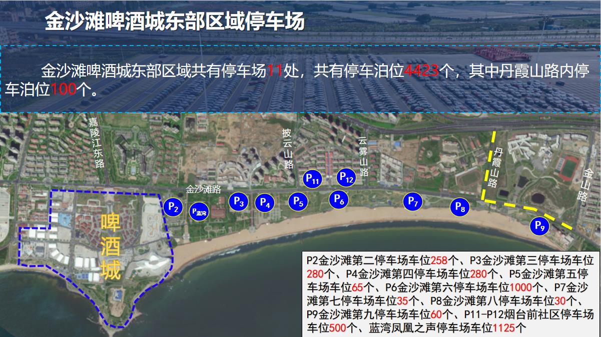 金沙滩啤酒城周边停车场分布示意图: