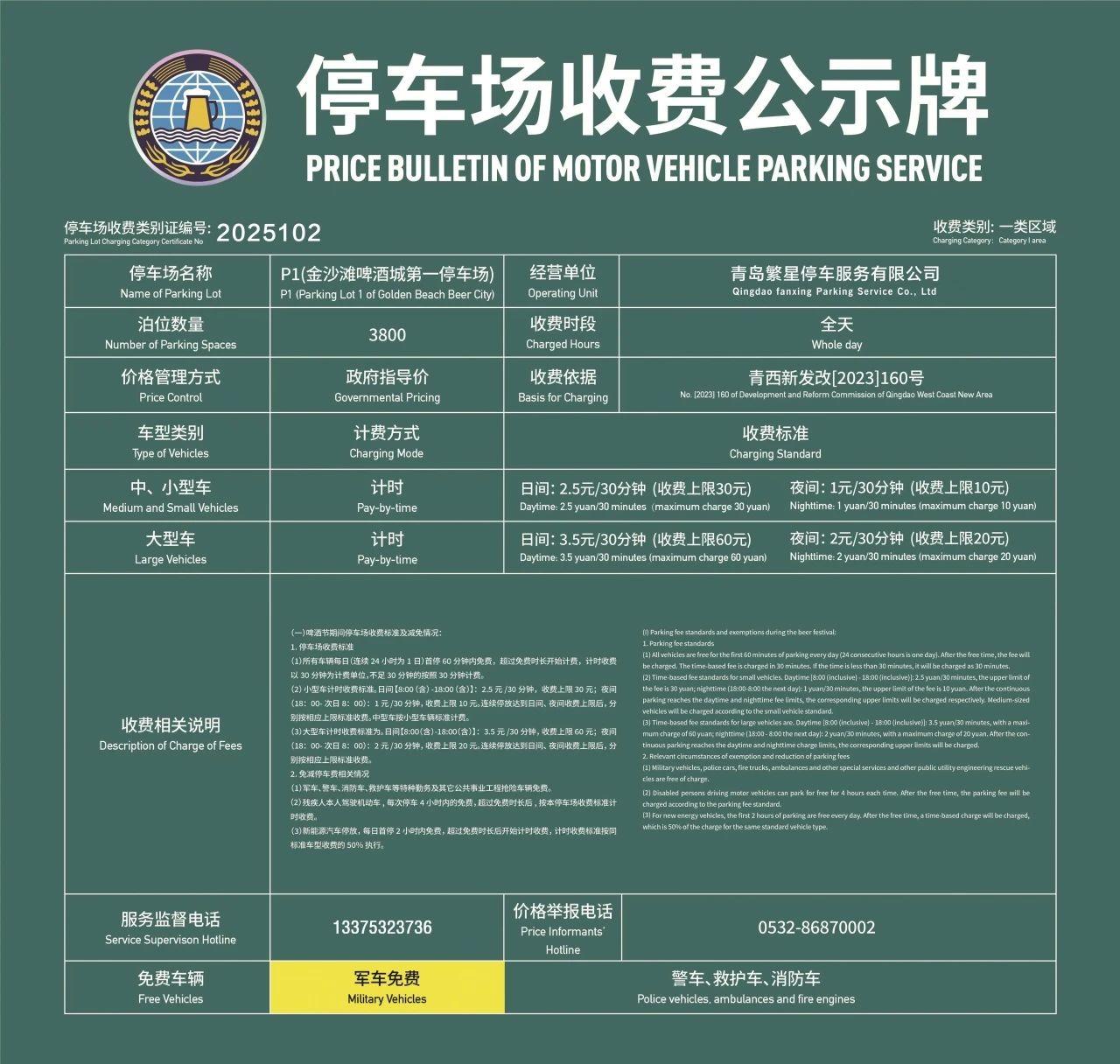 (5)啤酒节期间,到金沙滩啤酒城P1停车场停泊的车辆,凭山东省内景区或西海岸新区中超赛事的当月纸质门票首停享2小时免费停车优惠,超过免费时长后按本停车场收费标准计时收费。