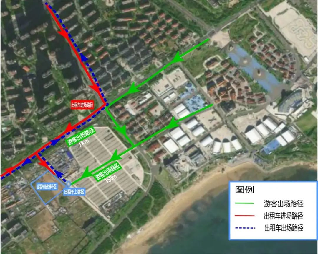 一是由金沙滩啤酒城主门(北大门)出场,沿金沙滩路、银沙滩路由东向西步行约1公里至巡游出租车上客区;