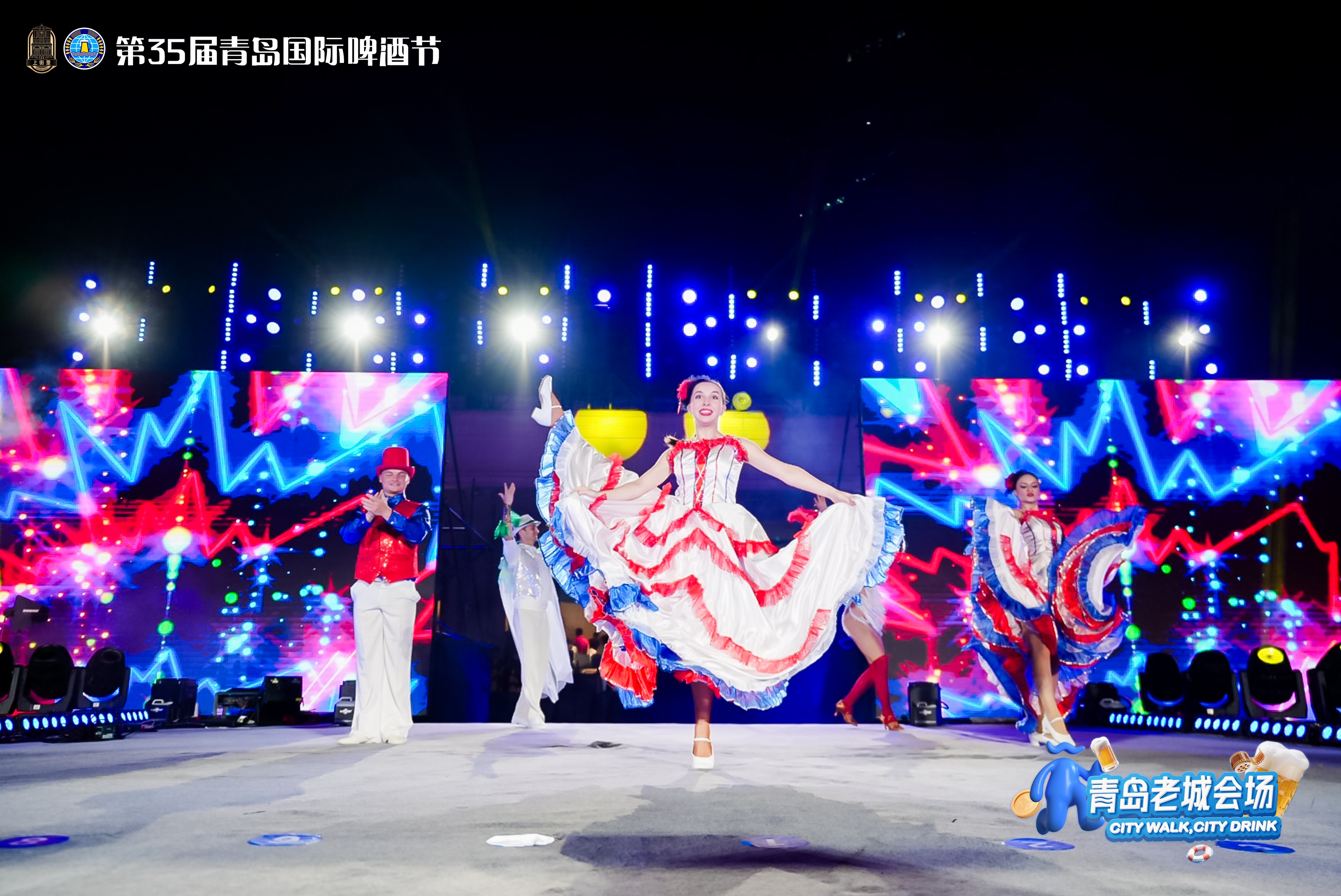 舞蹈《青岛干杯,全球欢聚》精彩亮相,多国籍舞蹈演员们用动人的舞姿表现国际友人的祝福融入老城的夜色,彰显青岛这座海滨城市的包容与热情,也呼应着三十五年间青岛与世界的深情相拥。