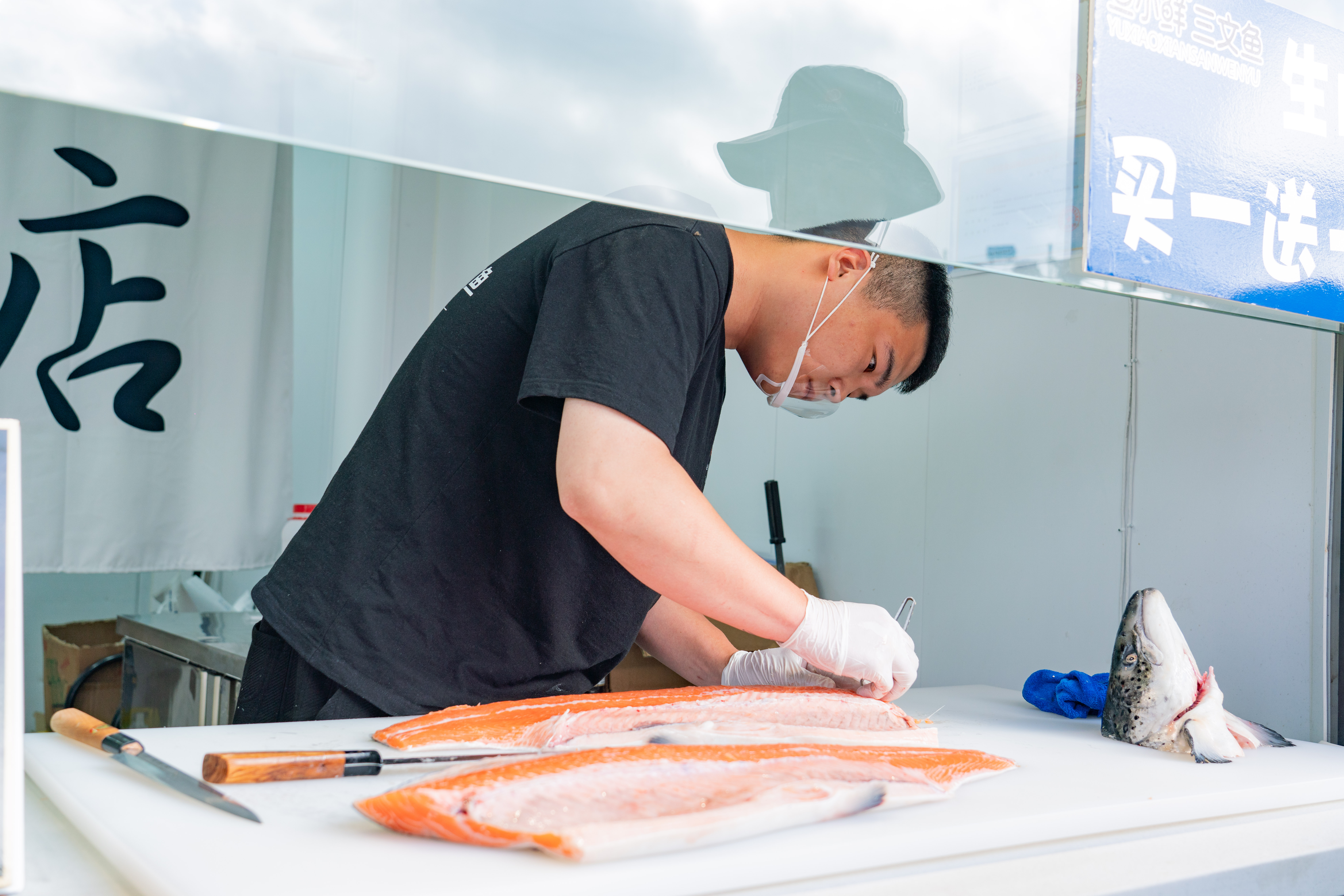 “鱼小鲜三文鱼”主理人曹岩介绍,这是品牌首次入驻金沙滩啤酒城,每日供应的三文鱼均通过冷链直送,坚持现开现售,日均能卖出七八条20斤左右的鱼。“我们准备的三文鱼体重超6公斤,品质和口感都有保障。”曹岩说,为了让更多人品尝美味,他们还推出了10元厚切尝鲜款。