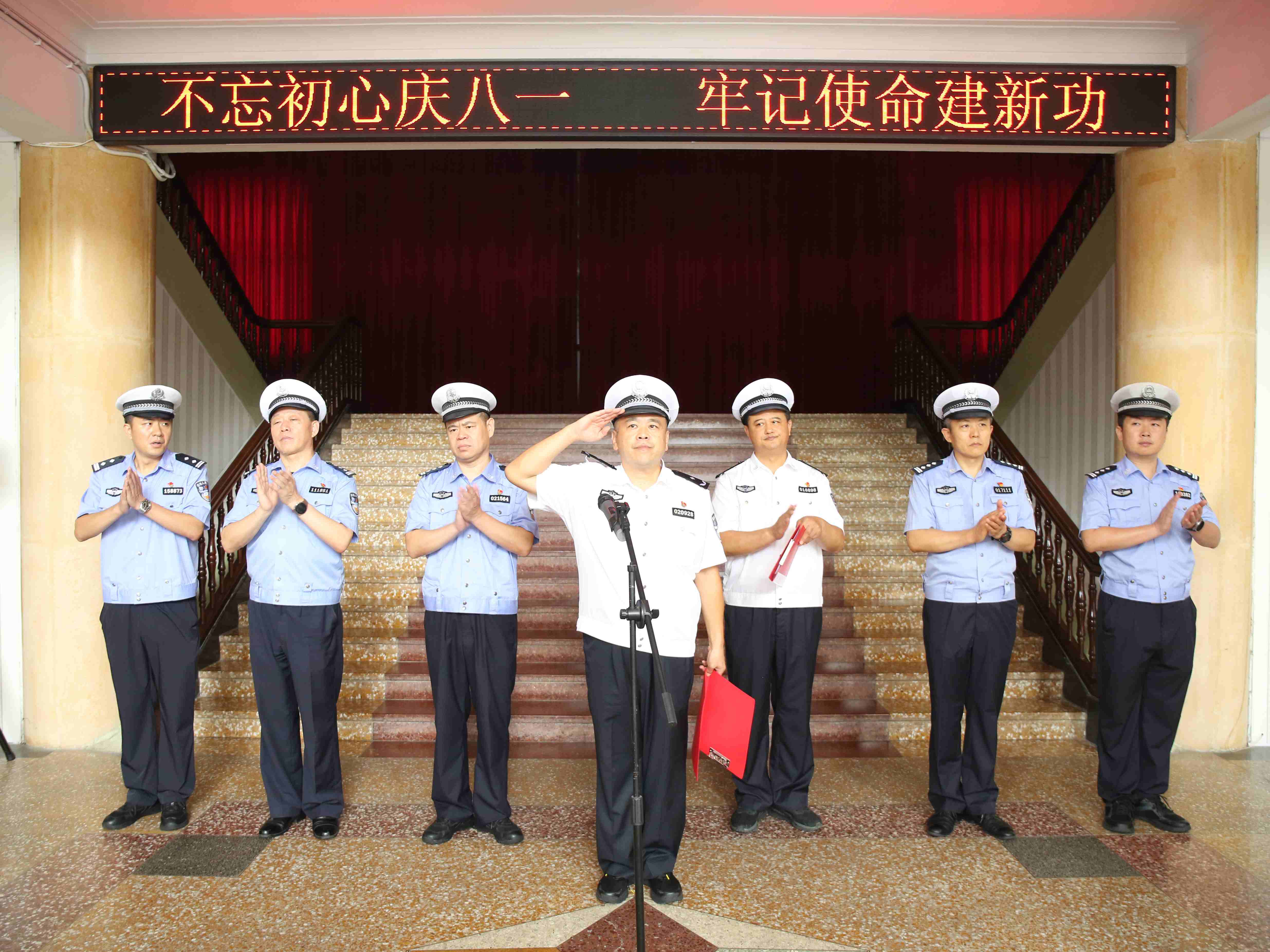 “我志愿加入中国共产党......”“我是中国人民警察......”“对党忠诚,服务人民......”“若有战,召必回”、“团结拼搏、担当奉献、勇打头阵、争当先锋”......在领誓人的带领下,全体人员高举右拳,面向党旗、警旗庄严宣誓。每一句誓词都饱含深情,展现着“退伍不褪色、转业不转志”的坚定信念。