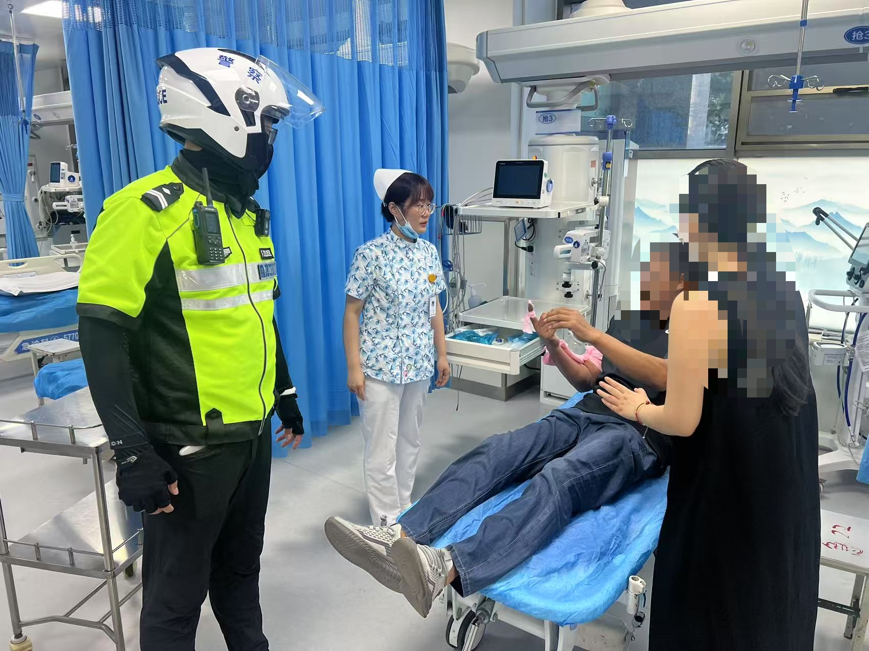 李村中队迅速指派铁骑队员纪晓龙、李志熹执行护航任务。17时15分,两位队员精准抵达重庆中路高架桥延寿宫路下桥口,与载有伤者的车辆成功对接。时间就是生命!铁骑立即拉响警笛,在滚滚车流中开辟出一条畅通无阻的绿色通道。警灯闪烁,争分夺秒,仅用时4分钟便将伤者安全护送至八医急诊部,为伤者注射抗蛇毒血清赢得黄金时间。