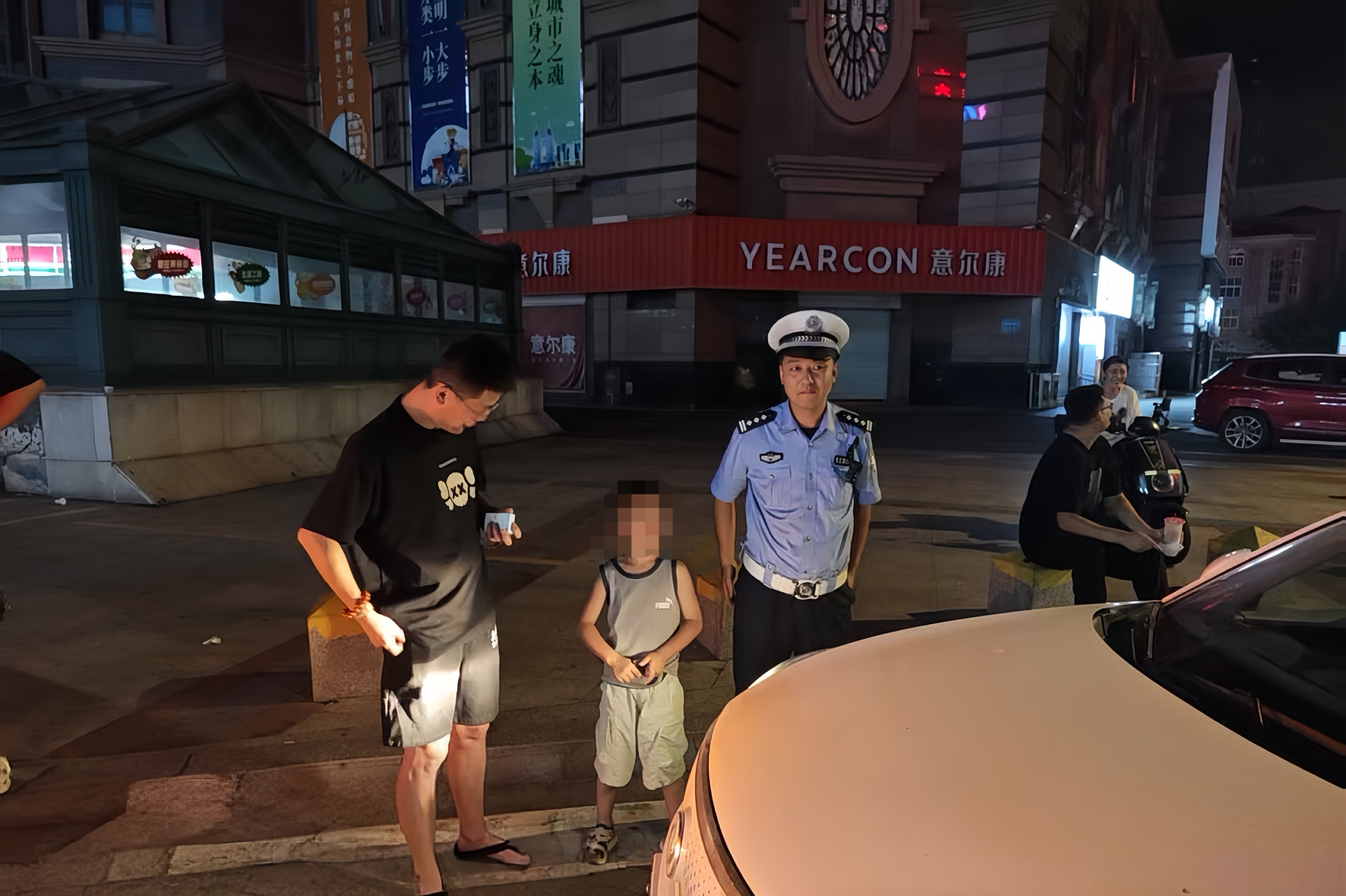 2025年8月5日晚23时35分,青岛市李沧交警李村中队民警贺军亮与辅警纪晓龙在京口路与向阳路交叉口处置一起交通事故时,一名热心市民带着一名男童上前求助。经了解,该男童在夜市游玩时与家人走散,市民发现后立即向执勤民警寻求帮助。