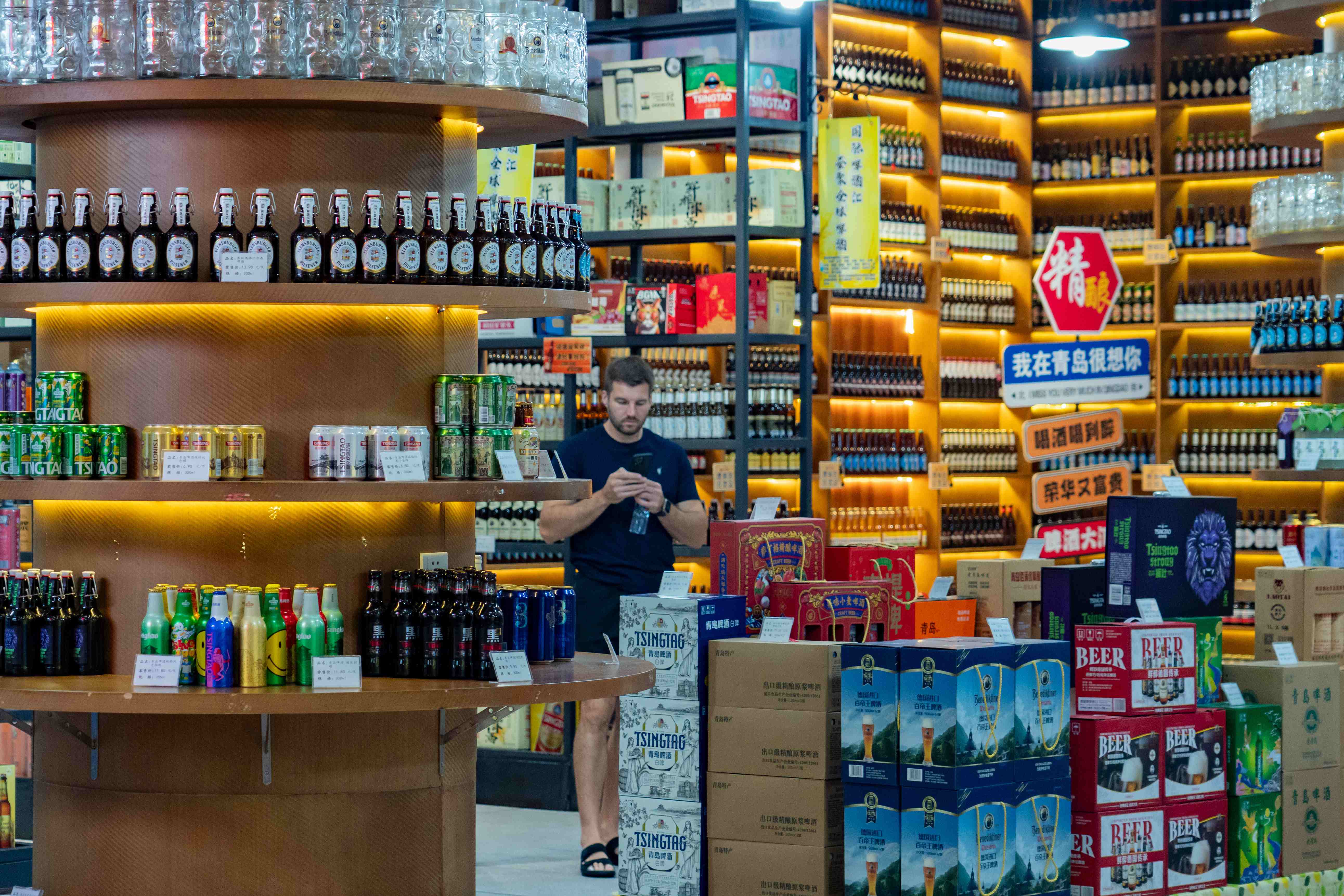 在金沙滩啤酒城,还有一个“爱酒人”的秘密基地,那就是国际啤酒汇。这里汇聚来自中国、德国、比利时、美国等国家的精选啤酒,涵盖工业啤酒、传统啤酒、精酿啤酒、无醇啤酒等全品类佳酿,种类丰富、品质优良、价格亲民。从0度无醇到67.5度蛇毒,从经典1664、科罗娜到热门IPA、果味精酿,再到啤酒礼盒……20余个国家的300多款精酿啤酒,让你放心购、放心喝。