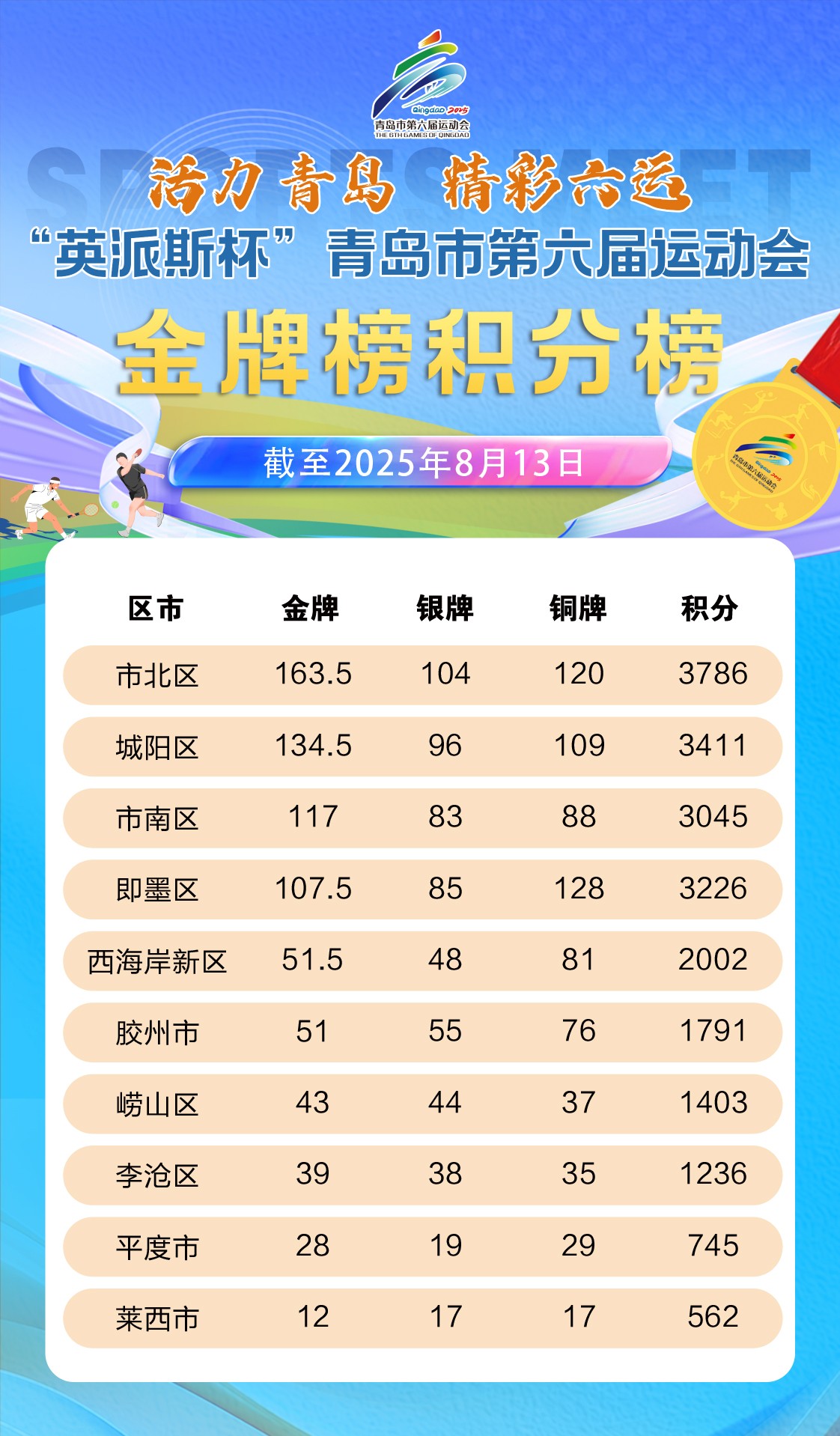 活力青岛 精彩六运“英派斯杯”青岛市第六届运动会金牌榜积分榜(截至2025年8月13日)
