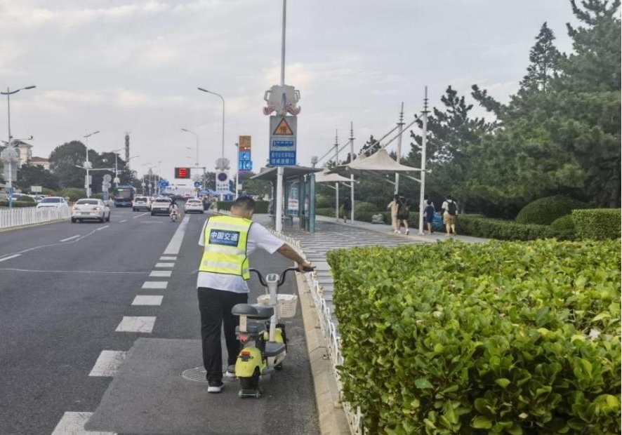 八月初的青岛,正值盛夏。虽然海风阵阵,也并未驱散炎热,带来多少清凉。上午九点半,第35届青岛国际啤酒节西海岸金沙滩会场周边,身着荧光色制服的交通执勤人员已开始忙碌。“您好,电动车请停到对面专用停车区,谢谢配合!”看到在路边停车或观望的游客,执勤人员主动上前引导,指引游客规范停放电动车。啤酒节期间,青岛西海岸新区交通运输局共出动50余名执勤人员,组成3支服务队,坚守在金沙滩路、连三岛路和天目山路等啤酒城周边区域,维护电动车停放秩序,保障人行道安全畅通,为游客营造安心、舒心的出行环境。