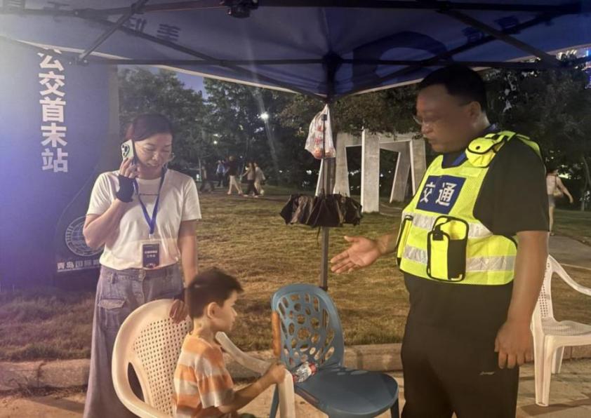 “小朋友,快下来,危险!”8月7日晚,执勤人员解新怡在啤酒城北1门附近,发现一名六七岁的小男孩趴在路边护栏上晃悠,她赶紧上前制止。小男孩带着哭腔说:“阿姨,我跟妈妈走散了。”了解原由后,解新怡立刻带他到执勤点休息,和队员尚新明、邢翠红一起安抚,并询问小男孩家长的联系方式。在电话拨通十多分钟后,小男孩妈妈气喘吁吁地赶来,当看到孩子安然无恙后,她长舒一口气,紧绷的面容终于放松下来。稍稍平复情绪后,她拉着孩子连连向执勤人员道谢。