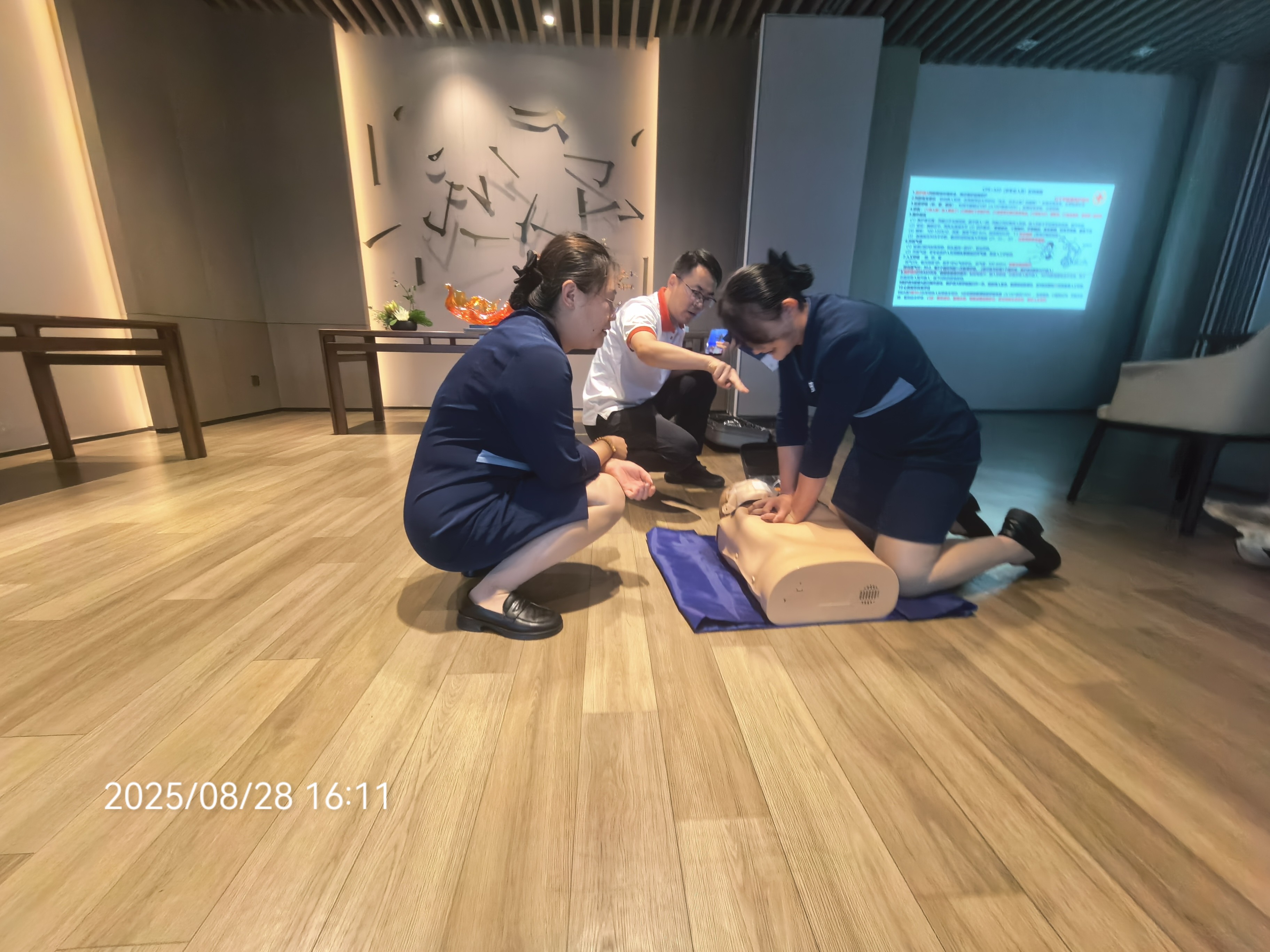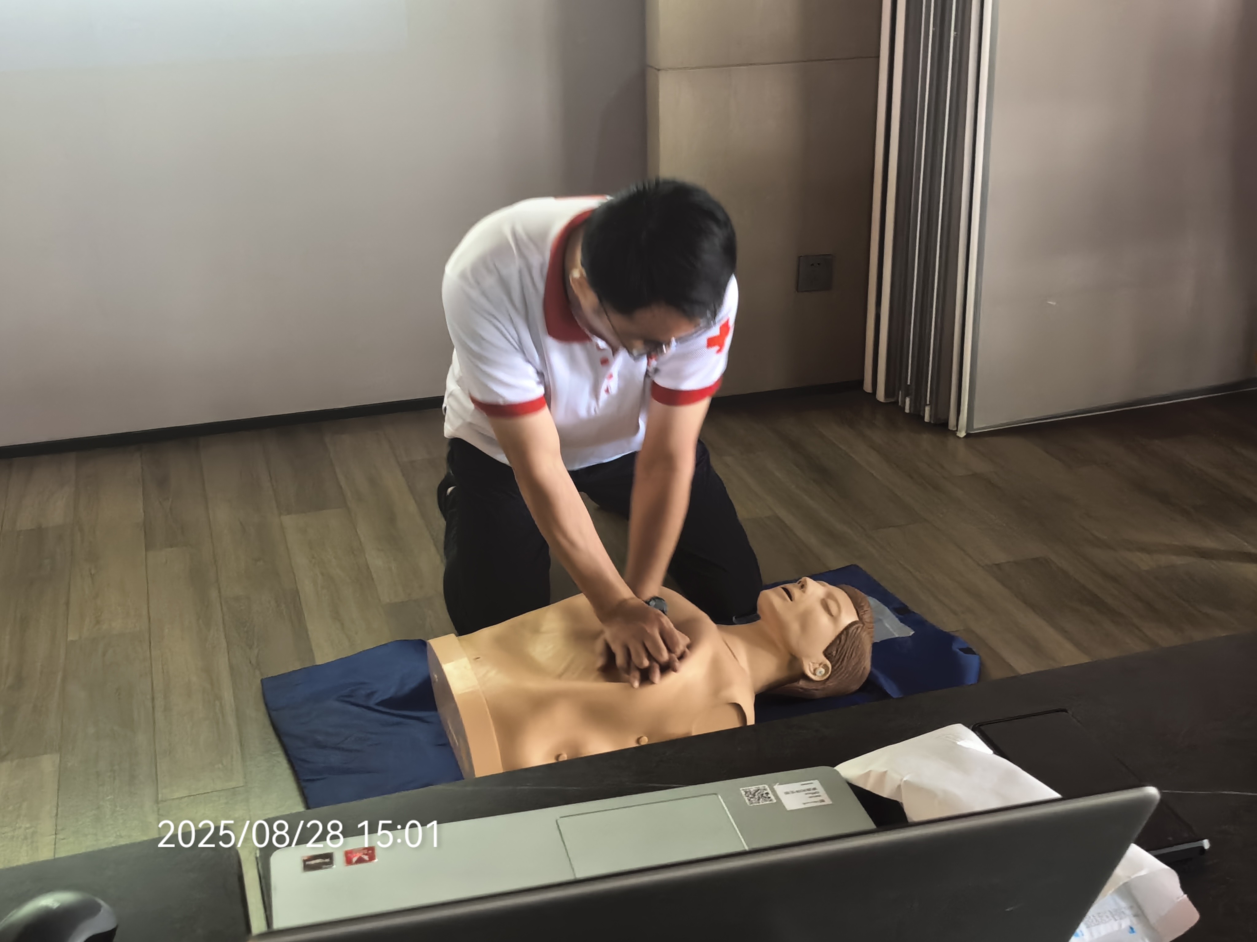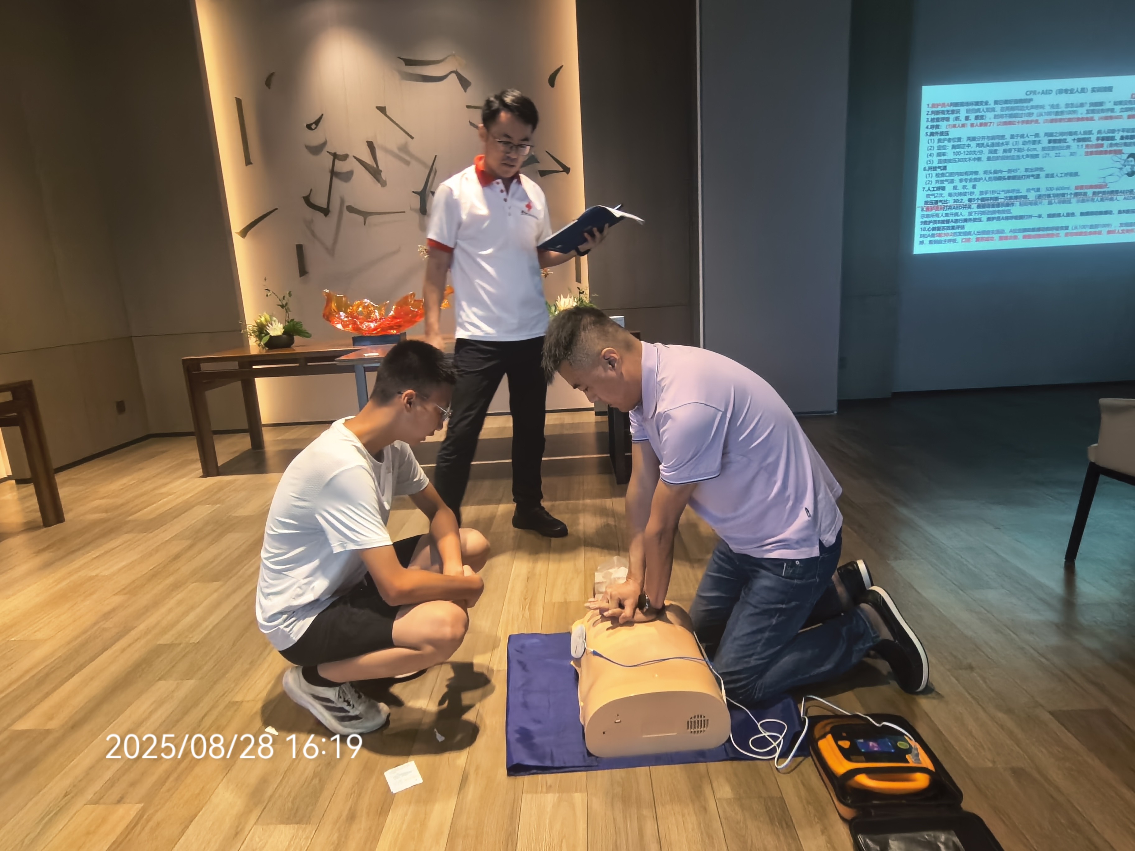 培训过程中,讲师杨海朋围绕心肺复苏(CPR)、自动体外除颤器(AED)使用、气道异物梗阻急救(海姆立克急救法)三大核心内容展开教学。理论讲解后,他亲自示范每一个操作细节:从判断患者意识、摆放急救体位,到按压深度与频率的精准把控,再到AED的开机、电极片粘贴位置,每一步都细致入微。为确保学员真正掌握技能,现场设置了实操环节,学员们分组使用模拟人进行练习,讲师针对操作中的不规范之处及时纠正,如按压位置偏移、力度不足等问题,手把手帮助学员调整动作,直到每个人都能熟练完成标准操作。