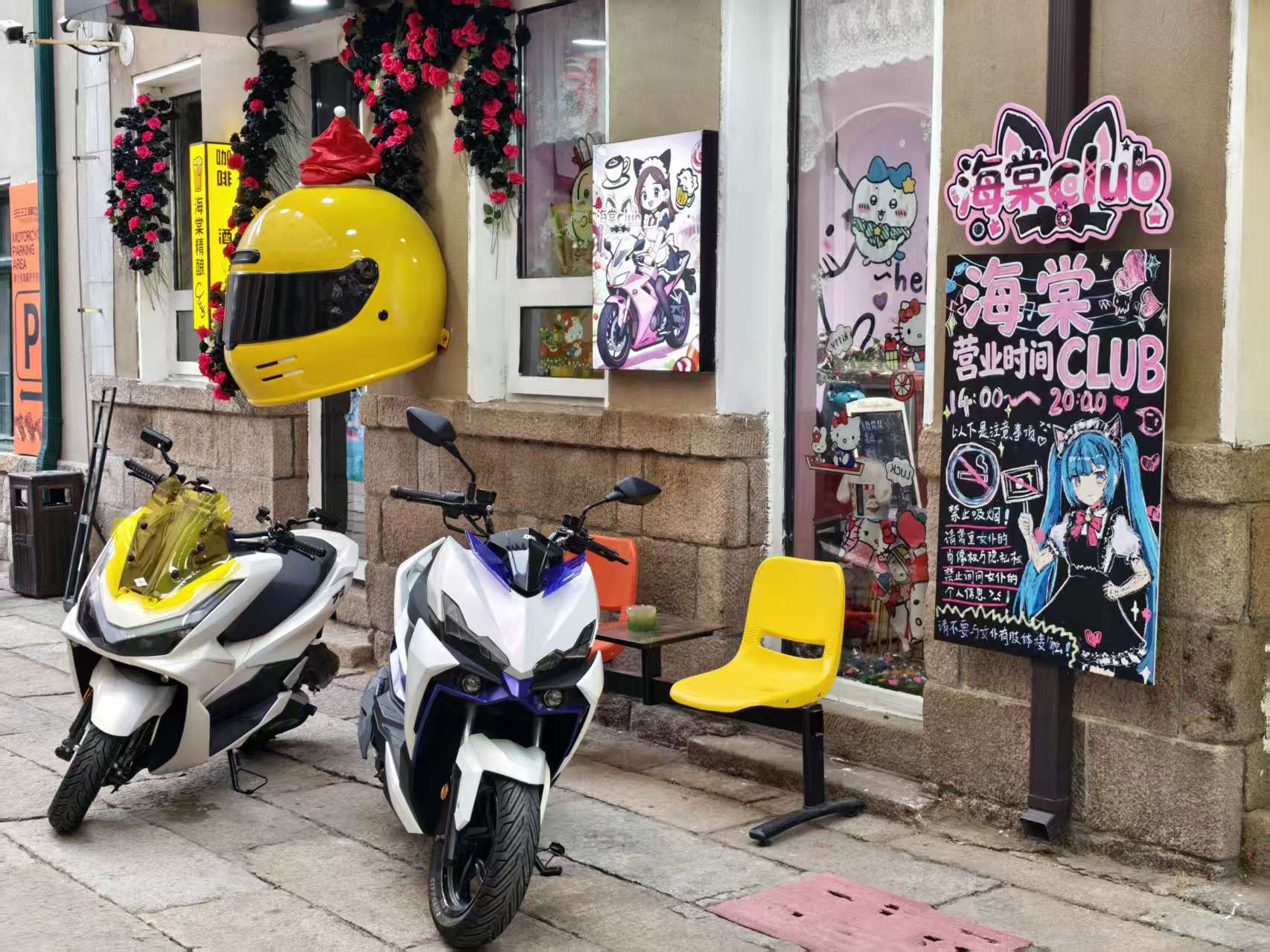 相隔不远的“海棠coffee”,则用另一种方式满足了Z世代的身份认同。一只巨大的摩托车头盔装置映入眼帘,机械感与潮流感扑面而来。这是海棠咖啡为“摩友”群体定制的社交图腾——骑手们可以在这里交流改装心得、分享骑行路线,咖啡店成了他们的“线下俱乐部”。