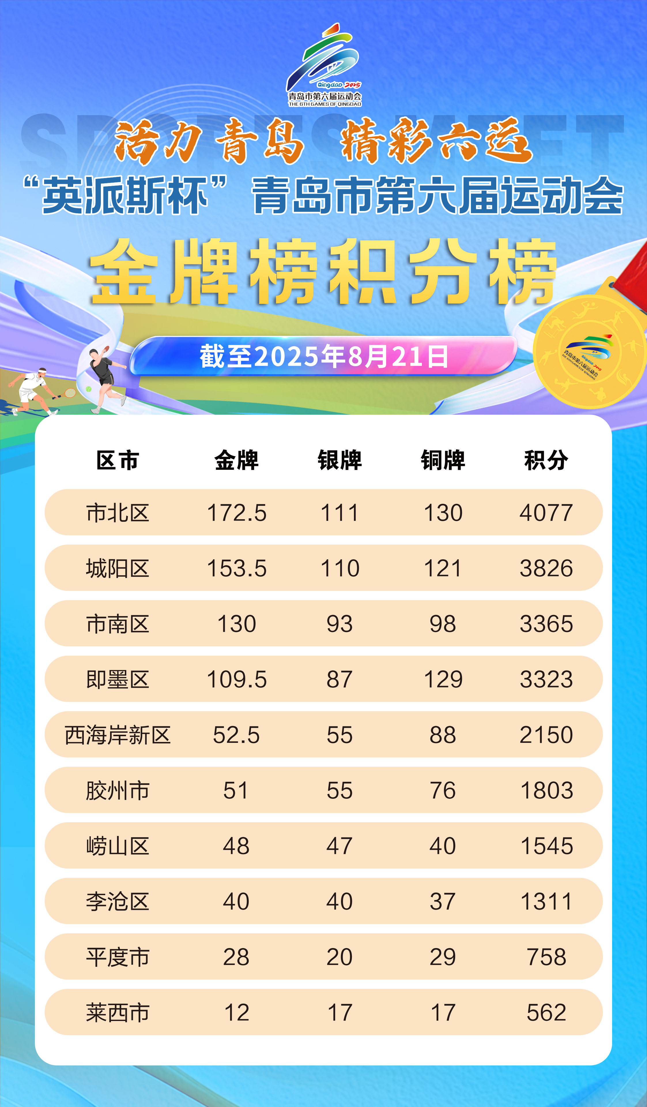 活力青岛 精彩六运“英派斯杯”青岛市第六届运动会金牌榜积分榜(截至2025年8月21日)