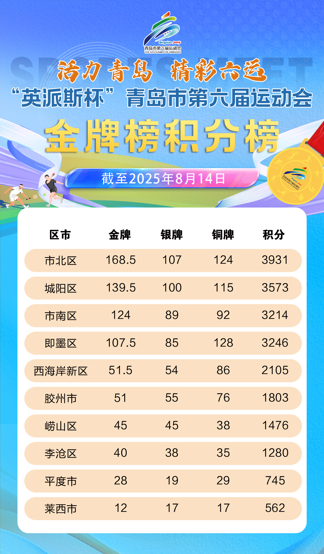 活力青岛 精彩六运“英派斯杯”青岛市第六届运动会金牌榜积分榜(截至2025年8月14日)