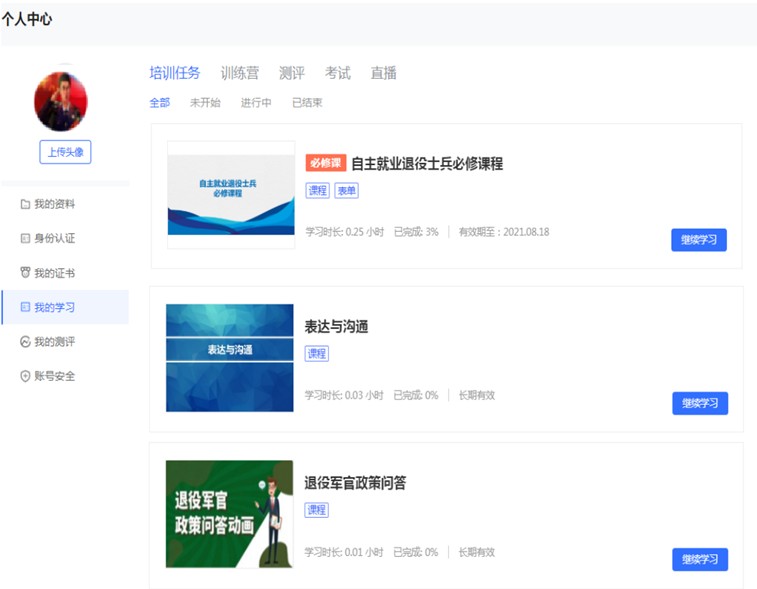 2.首次登录平台后,会自动跳转到填写个人资料页,在该页面完善个人资料信息(个人信息将完全保密),完成后会自动跳转到“个人中心”,点击“账号安全”模块可修改密码(建议首次登录后立即修改),点击“我的学习”页面即可免费获得110学时的学习时长,其中30学时为必修课程,80学时为选修课程,必修课程学完后方可学习选修课程。请在首次登录后的60天内,完成必修课程学习。