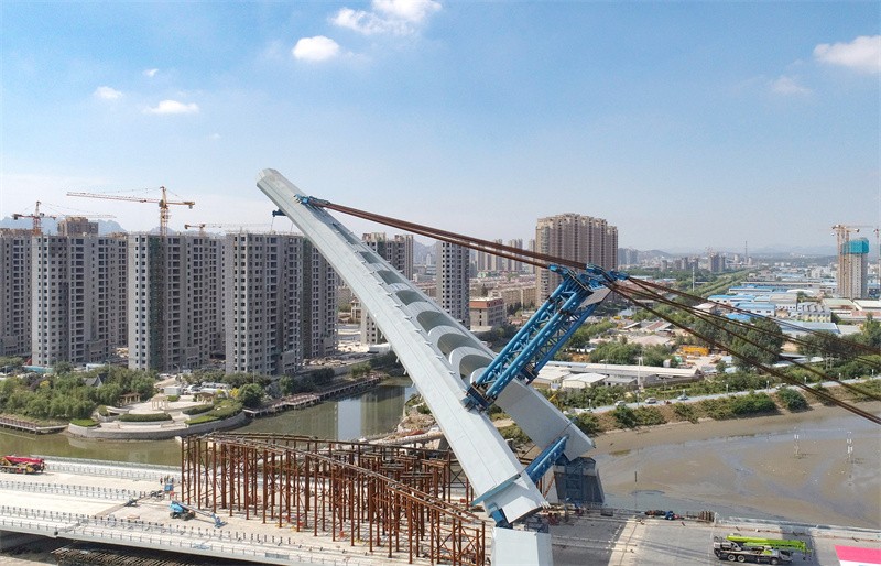 “我们项目采用成套的施工转体技术,保证钢主塔竖转稳定安全。”跨风河新建桥梁工程中建八局项目经理钟仁亮介绍道,在桥梁施工过程中,建设团队在国内首次采用大吨位、大丝束碳纤维材料,延长结构寿命,同时采用免栈桥滑移轨道安装、装配式钢栈桥应用、钢箱梁驮运安装等工艺,提高建设效率。