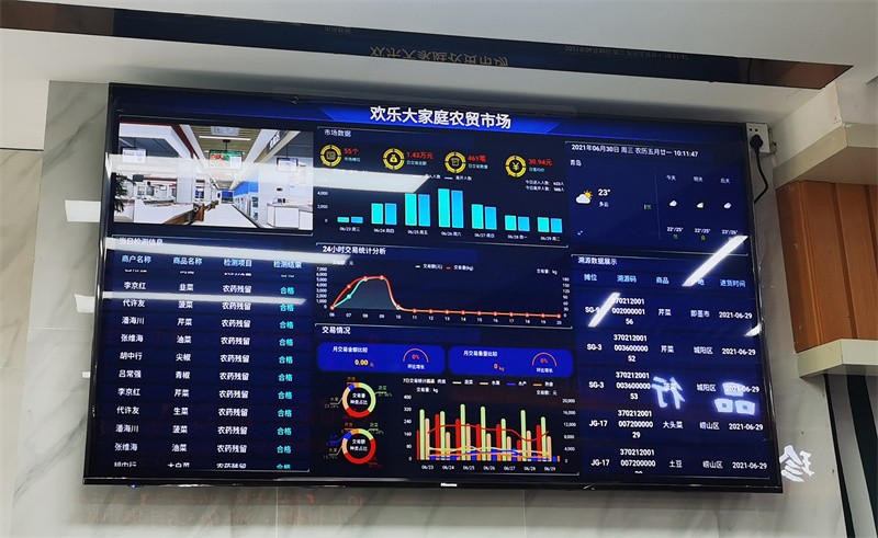 如今这里处处透着智能化。在欢乐大家庭农贸市场的外卖餐饮街,崂山区推出了青岛市首批‘互联网+明厨亮灶’, 19家外卖餐饮后厨也被接入崂山区明厨亮灶智慧监管系统和智慧农贸系统,群众到农贸市场购物,可以通过市场入口的智慧农贸大屏时时看到后厨情况,执法人员也可以实时监控,发现问题即时责令整改,让外卖加工过程也能像实体餐饮一样,随时处在政府和消费者的监督之下。同时还设有蔬菜检测室,每个摊位前都配备了智能电子秤,采用智能一码通,销售数据等可实时传回后台“智慧大脑”中。