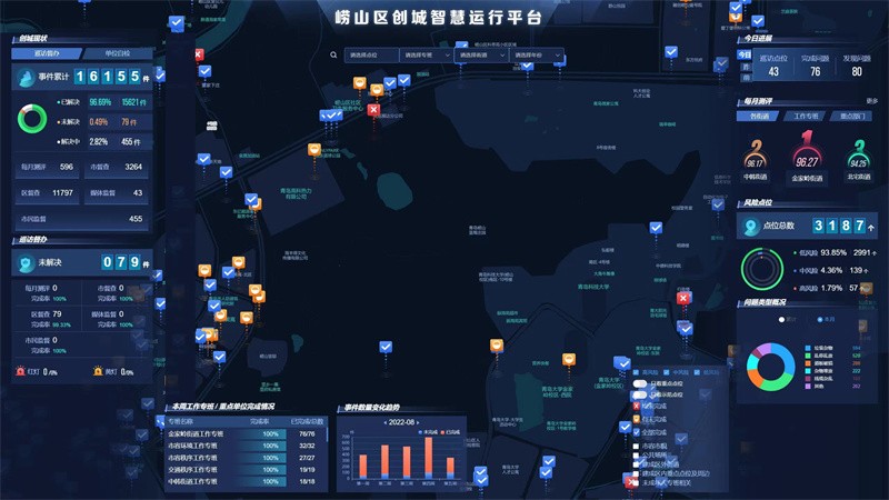 依托城市云脑建设,在争创全国文明典范城市中,崂山区加强AI赋能应用,深度挖掘应用场景,采用“1+1+5”架构,建设了1个文明城市创建数据中心、1个移动端小程序和创城一张图、领导驾驶舱、监督监管、指挥调度、创城工作管理5类智慧化应用,将整体部署、巡访督办、考核评比、领导督办、全景地图和风险点位等文明城市创建重点难点问题,在PC端、移动端实时动态展现、科学统计分析,达到了创建体系统一管理、创建任务一键分发、责任单位协同合作、创建进度一图掌控、市民参与快捷上报的效果,为文明城市创建工作全面数字化转型提供了有效支撑。