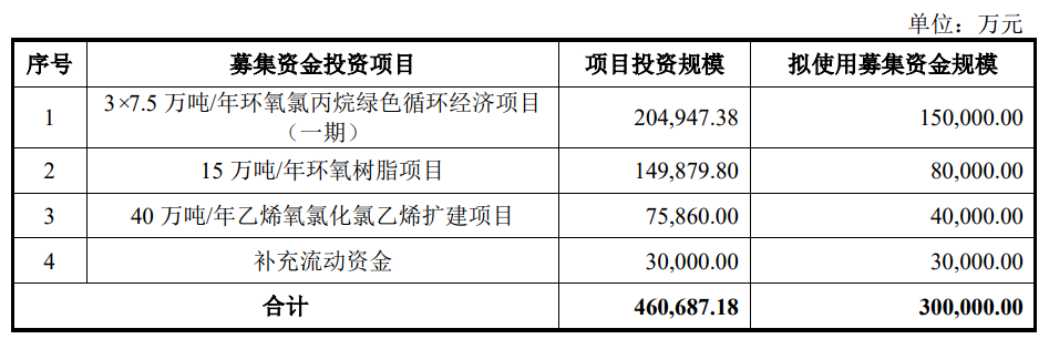 据招股说明书,海湾化学此次预计募资30亿元,将用于环氧氯丙烷绿色循环经济项目(一期)、15万吨/年环氧树脂项目、40万吨/年乙烯氧氯化氯乙烯扩建项目、补充流动资金。