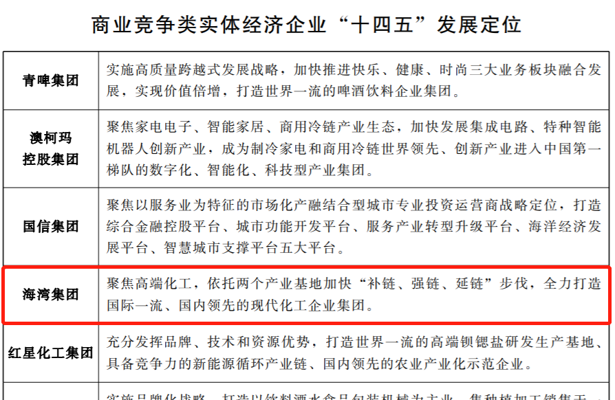 同月,《青岛市“十四五”国有资本结构调整战略布局发展规划》正式印发,规划中明确了海湾集团在“十四五”的发展定位,即聚焦高端化工,依托两个产业基地加快“补链、强链、延链”步伐,全力打造国际一流、国内领先的现代化工企业集团。