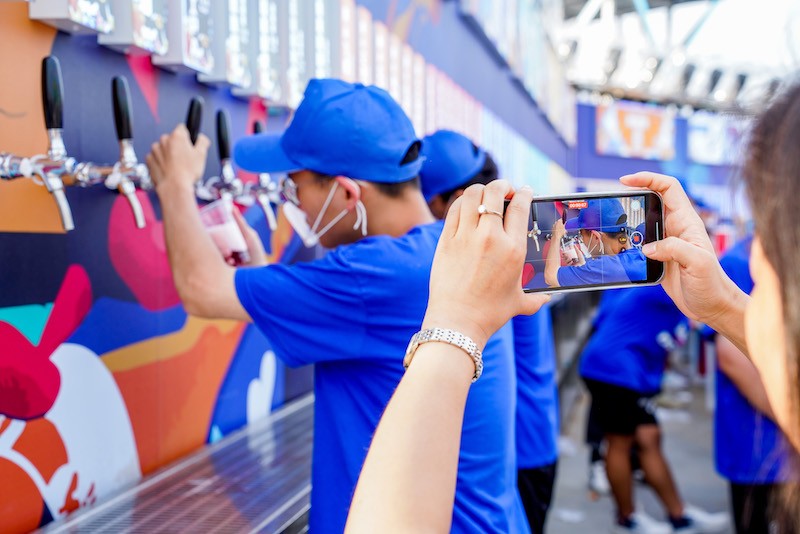 在“超级PENG”酒墙现场,围满了前来畅饮啤酒的游客。酒墙被布置成五颜六色、极具视觉冲击力的风格,每面墙上标注着当前区域的啤酒品牌和口味,“优布劳”“京A”“小札清醇”“啤啤嗨”……眼花缭乱的品牌吸引着众多市民游客前来打卡体验。“这里有上百种类型的酒,喝起来太过瘾了!”来自青岛市区的市民徐亮说道。