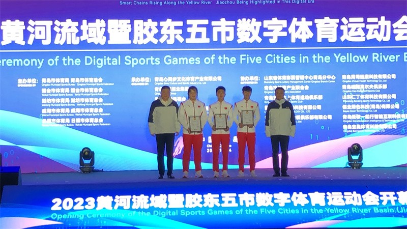 开幕式现场,国家体育总局水上运动管理中心副主任苏科和青岛市人大副主任、市总工会主席张建刚为第19届亚运会金银牌得主赵焕城、姜志超、陈琰颁发2023-2024年度数字体育推荐官证书,并邀请他们介绍数字体育对自己训练和比赛的帮助。