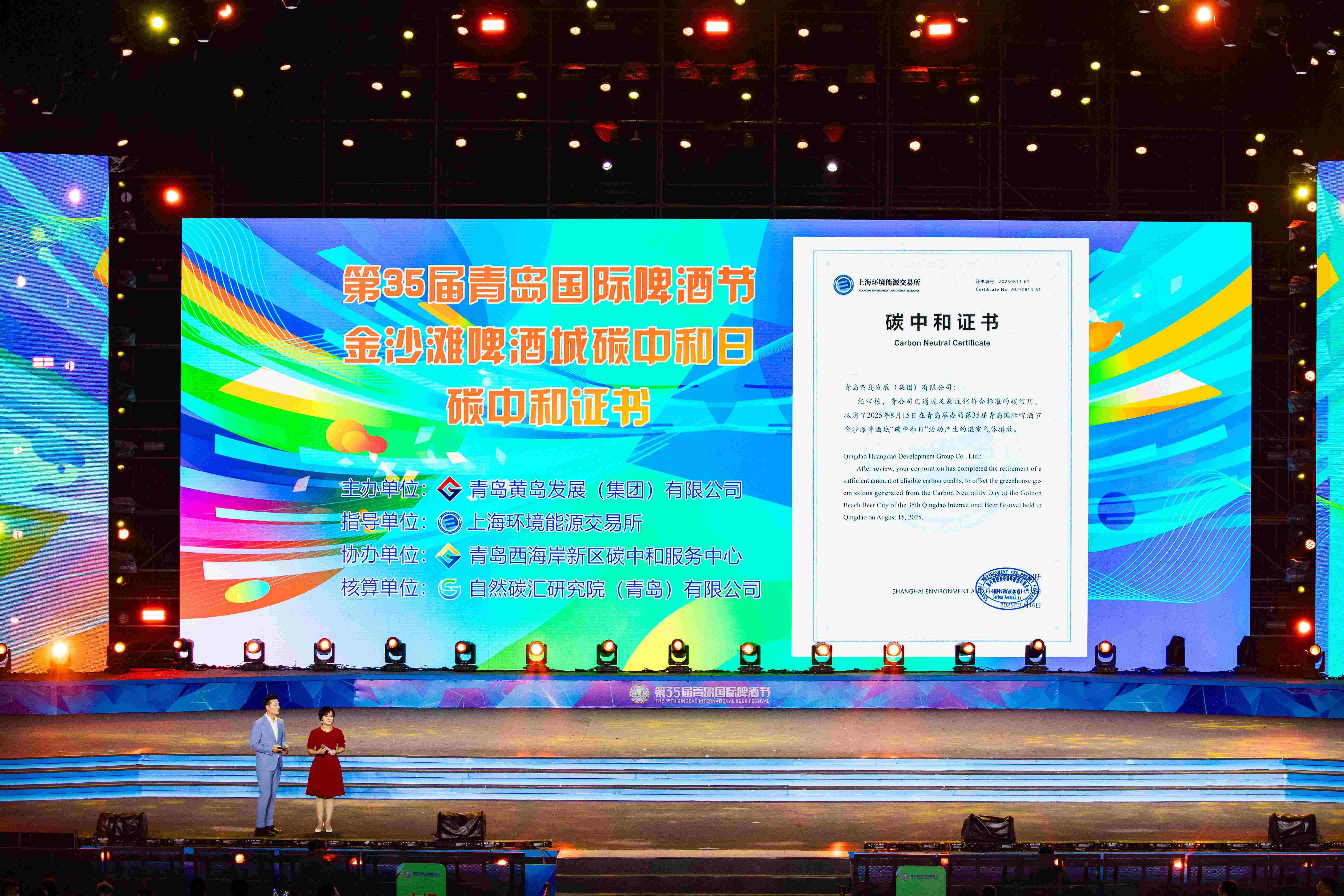 上海环境能源交易所向金沙滩啤酒城运营方青岛黄岛发展(集团)有限公司颁发碳中和认证证书。今年8月15日,金沙滩啤酒城成功实现单日碳中和,这在全国各类节庆活动中树立了标杆,贡献出绿色实践的“西海岸模式”。随着绚烂的烟花在空中绽放,本届啤酒节正式落下帷幕。活动最后,向所有参与啤酒节的幕后工作者致敬。