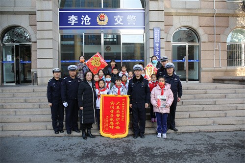 1月13日上午9点45分,来自青岛宾川路小学的16名学生代表和2名家长代表、2名教师代表来到青岛交警李沧大队,将写有大美交警护平安 宾川学子