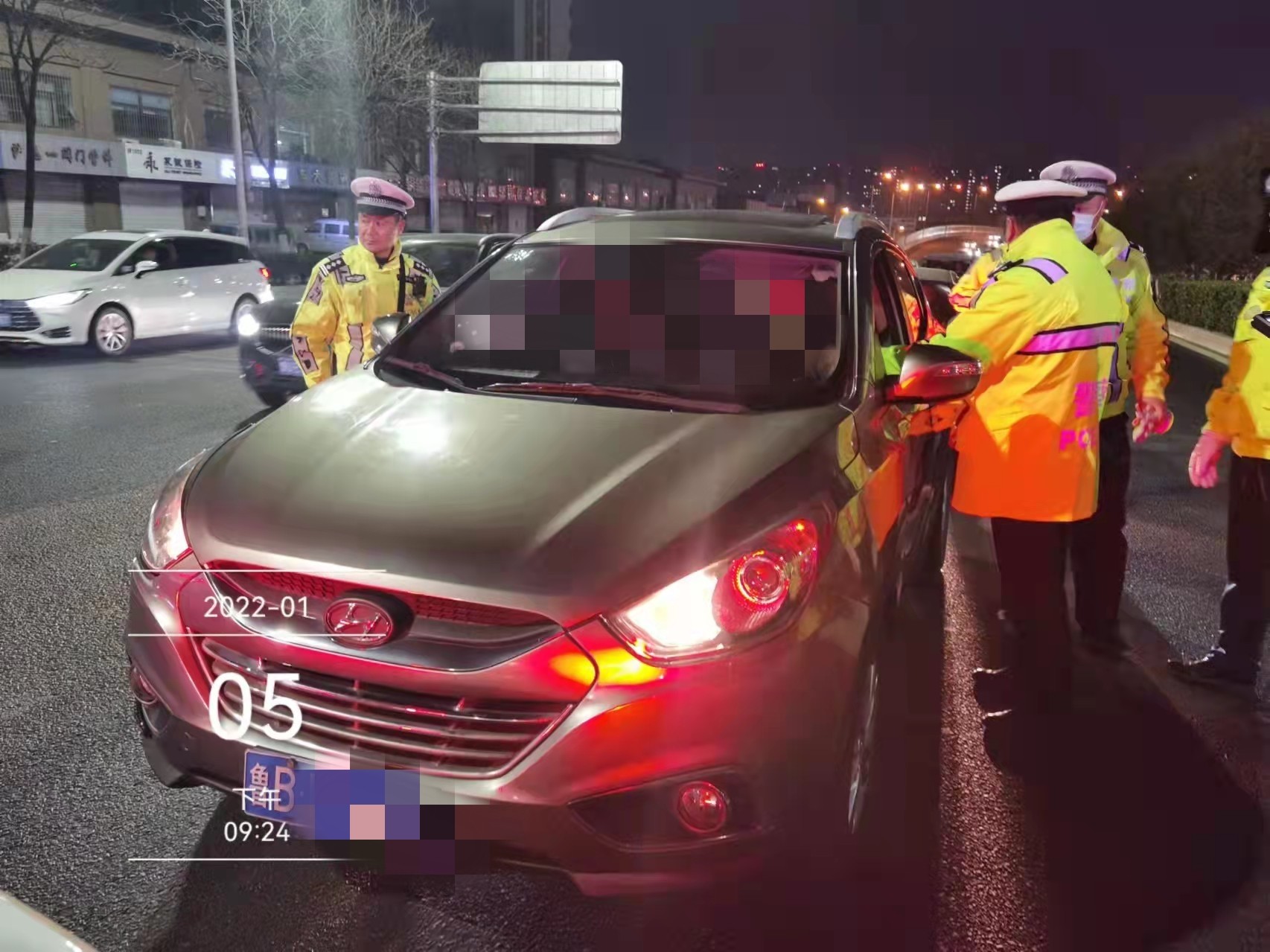2022年1月5日晚09:20左右,青岛李沧交警在重庆中路延寿宫路路口设点夜查。一辆棕色SUV汽车自南向北方向从重庆中路辅道拐入最左侧车道,短距