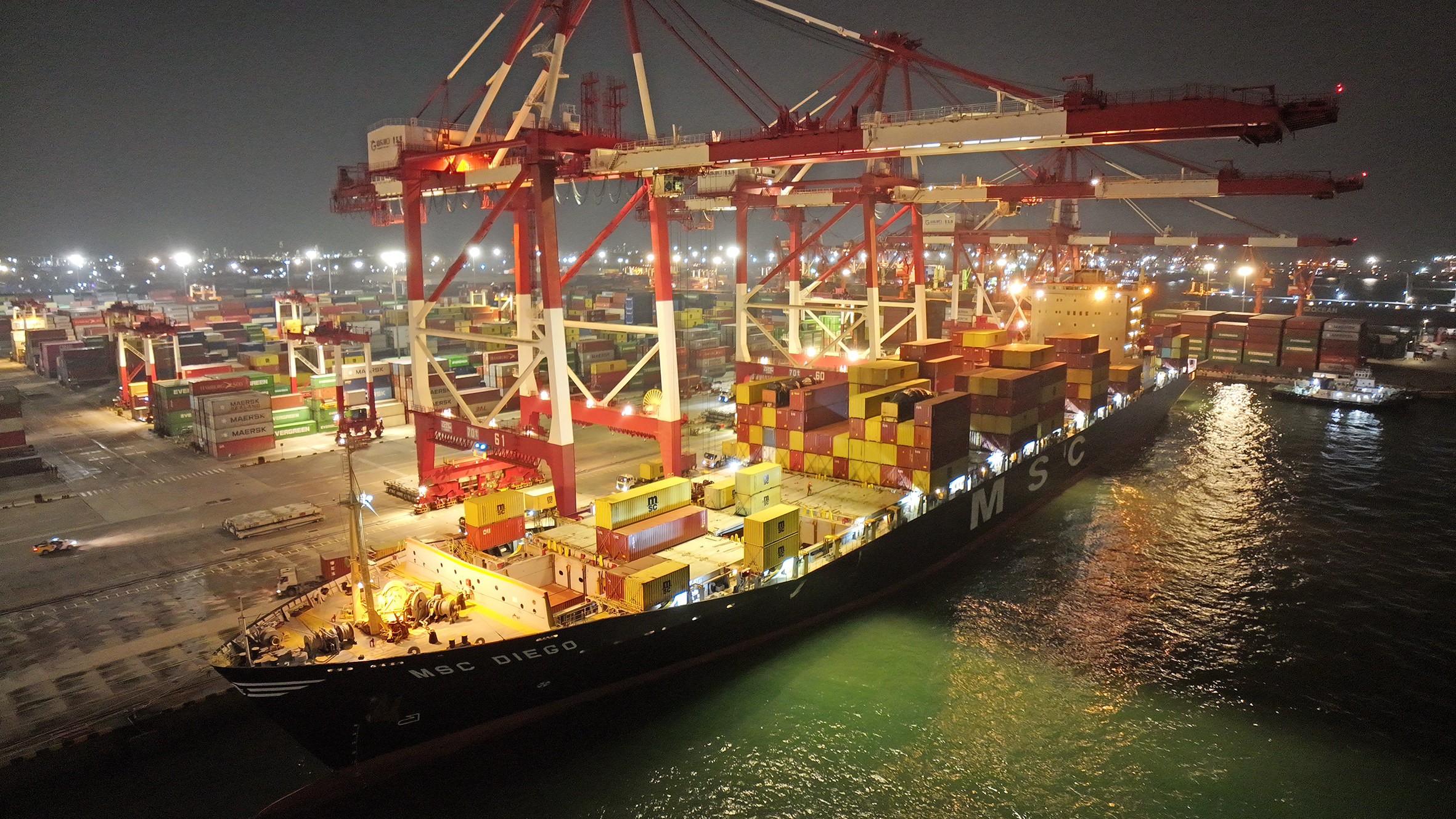 山东商报·山海新闻 高妍妍11月7日18:00,伴随悠长的汽笛声,地中海航运(MSC)全新推出的SAMBAR航线(地中海东南亚航线)首班船舶——地