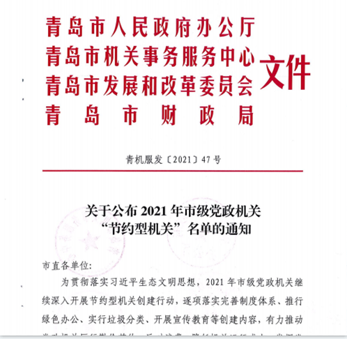 2021年12月30日,青岛市人民政府办公厅、青岛市机关事务服务中心、青岛市发展和改革委员会、青岛市财政局联合印发《关于公布2021年市级党政
