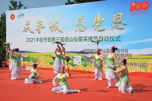 在这个丰收的季节,为庆祝新中国成立72周年,9月30日,青岛市崂山区北宅街道举办了“庆丰收·感恩”2021丰收节暨崂山仙菊采摘节活动启动仪式。居民们在用欢歌热舞喜庆丰收的同时也祝福祖国更加繁荣昌盛。