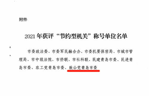 2021年12月30日,青岛市人民政府办公厅、青岛市机关事务服务中心、青岛市发展和改革委员会、青岛市财政局联合印发《关于公布2021年市级党政机关‘节约型机关’名单的通知》(青机服发﹝2021﹞47号),授予包括致公党青岛市委在内的11家单位“节约型机关”称号。