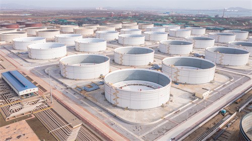 据了解,山东港口青岛港董家口原油商业储备库工程位于董家口港区摩科瑞库区北侧,振华库区南侧,东侧临近规划园区道路,疏港铁路火车装卸站位于库区西侧。项目总投资约49.8亿元,总占地面积1681.56亩,主要储存原油、燃料油及稀释沥青。项目分三期建设,项目一期工程已于2021年建成投产;本次投产运营的二期工程,共建设24座10万立方米浮顶油罐,总库容240万立方,配套建设2座现场设备间和2座泡沫站,结合已建一期工程输油泵及预留接口,二期工程可以实现原油储备和周转的功能;三期工程共12座储罐 (120万立方米容量)工艺配管及相关配套设施,预计2023年6月建成。
