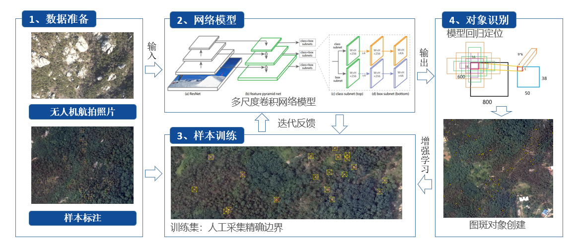 精准识别。一方面,自主研发并构建了全国最大的人工智能数据集BH-LHRAF,拥有1000万个样本数据,涵盖春、夏、秋、冬全年变化特性,有效支撑了高性能算法模型的训练、推理,实际测试准确率(非理论值)优于95%。另一方面,基于Retinanet模型框架,依托军用目标侦查技术进行转化,自主研发枯死松树识别AI算法,识别准确率可达97.22%。