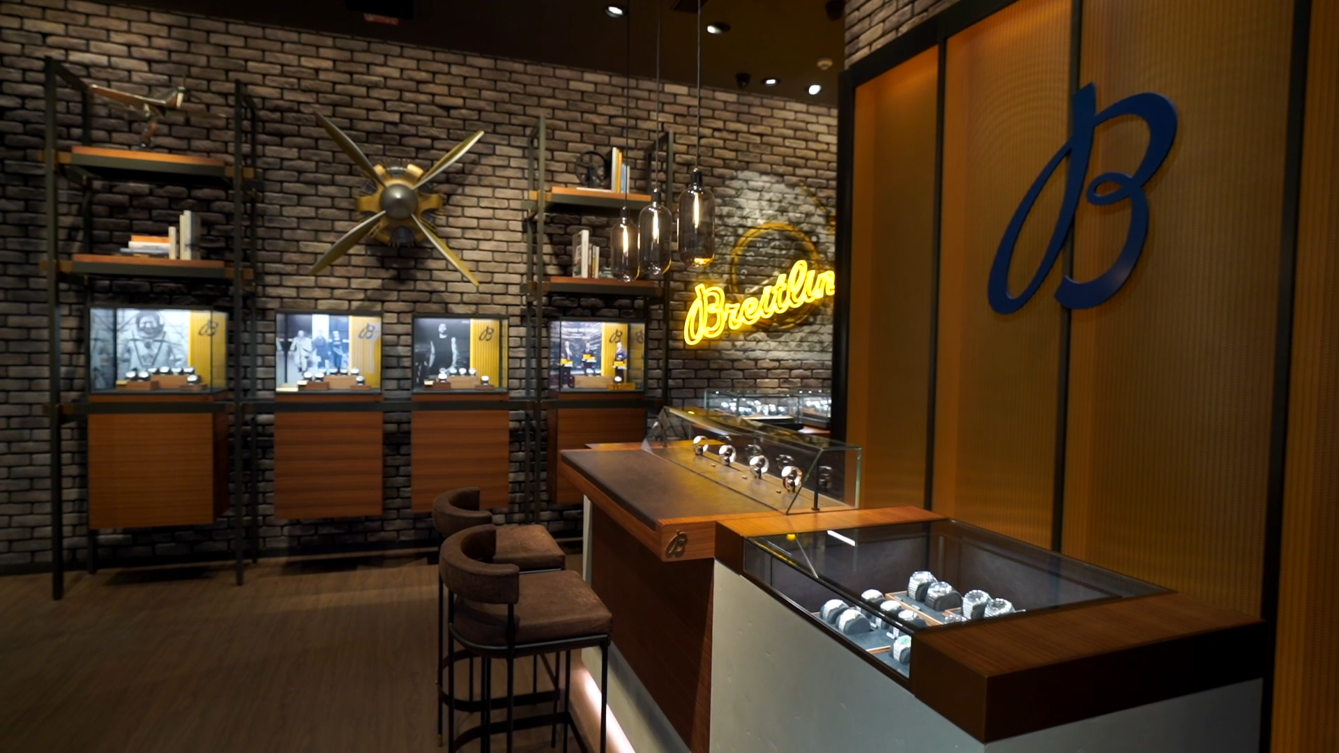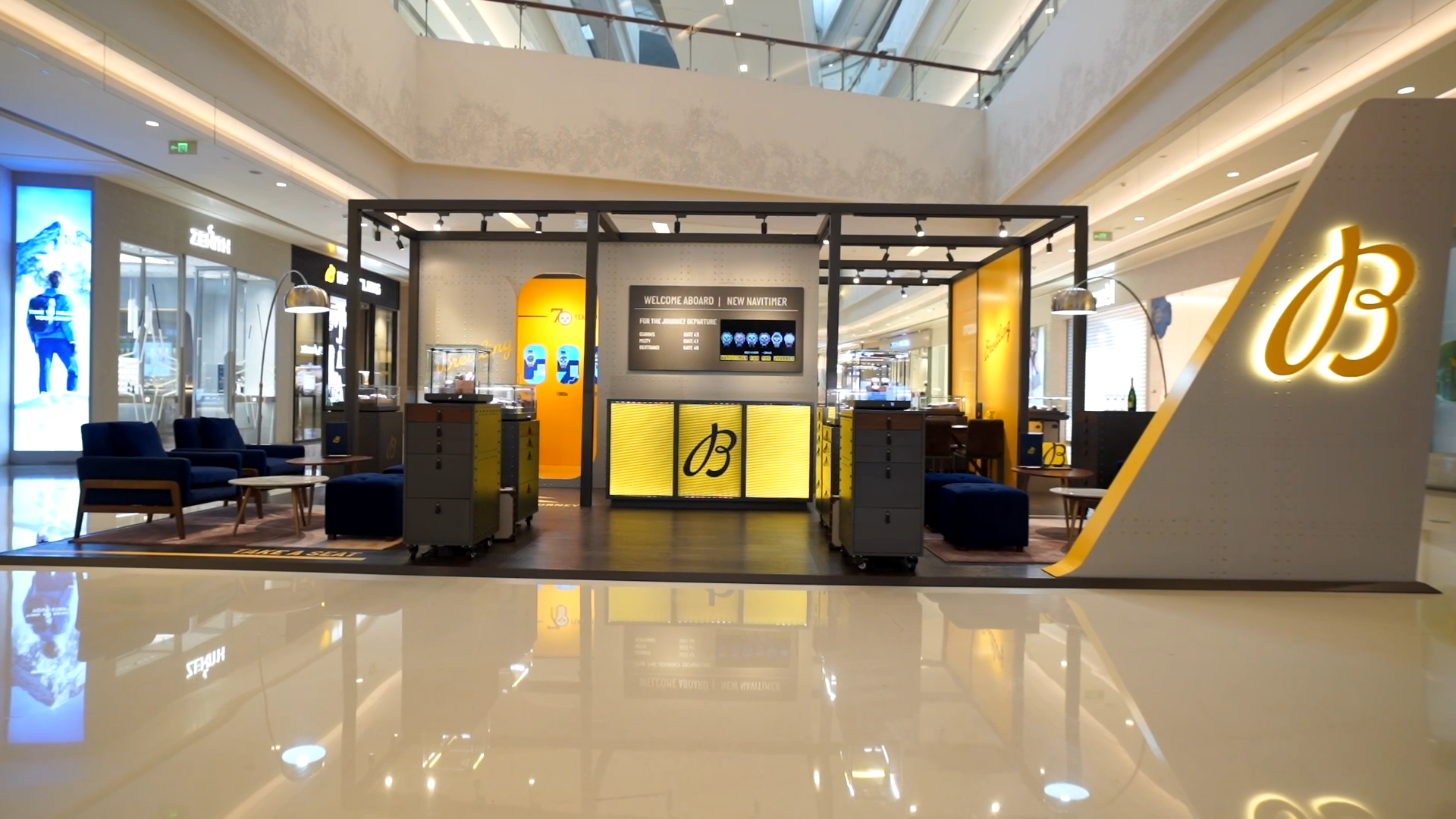 1884年诞生的百年灵是现代计时码表的开创者。这家全新百年灵精品店位于青岛万象城北庭一层,店铺设计延续品牌标志性的工业阁楼风,酷感十足的黑色钢架结构与鲜明黄色主色调相搭配,呈现以“天空”“海洋”与“陆地"为主题的腕表作品。同样的设计语言也贯穿 Navitimer航空计时巡展,以品牌名声卓著的“王牌飞行员腕表”-航空计时系列(Navitimer)为主角,透过一扇扇以蔚蓝天空为背景的“飞机舷窗”回顾该系列逾70年的传奇历程,展现百年灵品牌近150年浓厚的历史底蕴和丰沛的创新精神。从“登机”,“起飞”到“落地”,观展者可以感受身在机舱、飞跃时间线的沉浸式航行体验。展区最醒目的当属巨型涡轮风扇装置,造型逼真吸晴,引来众多品牌和飞行爱好者在此留影。