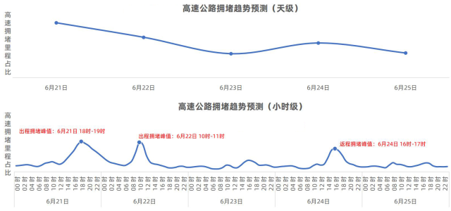 6月22日(假期第一天)为高速出程拥堵高峰,9时-12时是出程高峰时段,峰值出现在10时-11时;6月24日(假期第三天)15时-18时为高速返程拥堵高峰,峰值出现在16时-17时, 6月25日高速路况恢复正常水平。提醒市民合理安排时间,错峰出行。