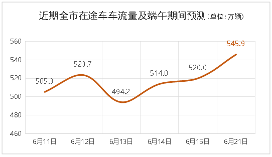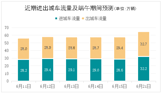 根据五一期间监测的7条主干道及胶州湾隧道、胶州湾大桥交通节点流量数据分析发现,节假日期间日均进出城总流量约比平日高12.8%,其中出城流量略高于进城流量,因此预计端午期间每日进出城总流量在64.9万辆左右,出城32.7万辆,进城32.2万辆。