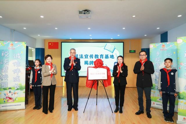 现场,由冯洪珍、陈绪发、李建忠、张拥军、于前和校长朱雪梅共同为“市南区税法宣传教育基地”“市南区青少年税法教育实践基地”揭牌。