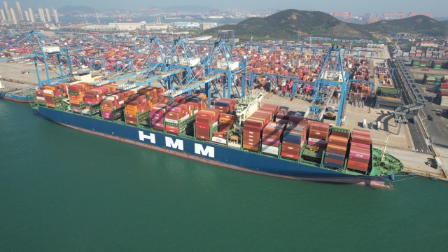 5月9日,山东港口青岛港自动化码头“韩新努力”轮正在接岸电作业,这是2024年以来应用高压岸电的第106条集装箱船舶,青岛港的岸电接电量已超过2023年全年接电量。