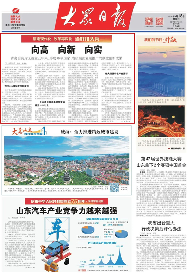 9月18日,《大众日报》头版头题“锚定现代化 改革再深化 当好排头兵”专栏刊发《向高 向新 向实》,报道中国(山东)自由贸易试验区青岛片区挂牌设立5周年以来,以国家战略为指引,对标国际高标准经贸规则,深入推进制度型开放,加快构建现代化产业体系,聚力打造高水平对外开放新高地。