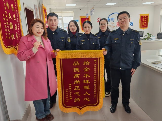 红彤彤的锦旗承载了一段暖心的故事。2月13日清晨,孙涛如往常一样早早来到了运政窗口,走到门口时,突然踢到了一个“小石子”,他捡起来一看,竟然是一枚金灿灿的戒指,分量十足,工艺考究,显然价值不菲。想到可能是前来办理业务的群众不慎遗失的,孙涛立即将戒指上交至运政窗口负责人于滨。随后,于滨安排工作人员调取了近期业务办理记录,逐一排查寻找失主,经过多方查找,终于联系上了失主祝女士。祝女士接过失而复得的戒指,十分激动,对工作人员连连表示感谢,并送来了致谢锦旗。