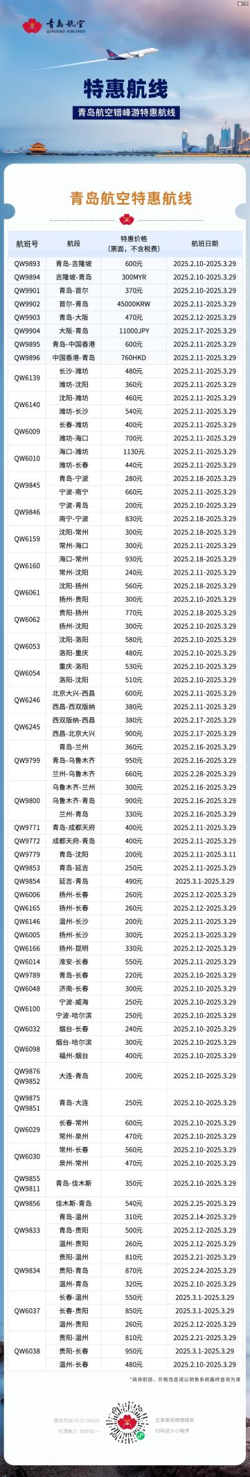 新年出行,就选青岛航空!即日起至3月29日,青岛航空机票大促震撼来袭!无论是奔赴海滨之城邂逅浪漫海风,还是飞向古都探寻历史底蕴,又或是前往繁华都市畅享潮流生活,青航航线网络全覆盖,带你轻松抵达心仪之地。错峰出行,价格更优。别再犹豫,抓住新年出行好时机,搭乘青岛航空,开启蛇年专属奇妙之旅 ,以实惠价格拥抱远方的精彩!