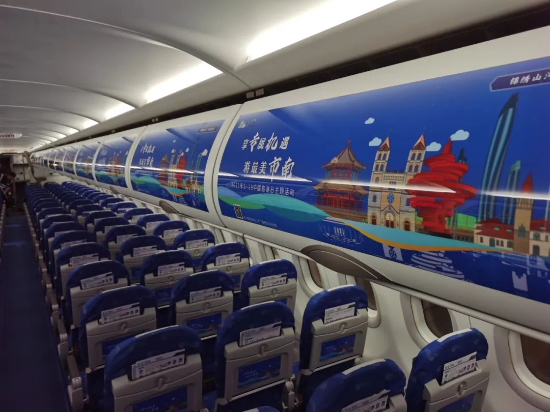 本次活动,市南区创新推出“享专属‘机’遇,游最美海湾”主题宣传活动,通过与青岛航空深度合作,开辟旅游宣传新路径。将三万英尺高空化作流动的城市会客厅,以沉浸式体验开启文旅宣传新场景。航班机舱内,行李箱区域及小桌板张贴的市南区旅游主题广告格外醒目,营造出浓厚的市南旅游氛围。飞行过程中,乘务人员向乘客免费发放市南旅居地图、市南区专属优惠礼包、活动限定帆布包、文创抱枕等超200份惊喜特色伴手礼,激发了乘客的打卡热情,不少乘客在社交平台分享照片,进一步扩大了市南区旅游的影响力。这场“云端打卡计划”打破传统营销边界,以航空场景的强触达性将旅游宣传前置,用年轻化设计激活游客分享欲。当飞机落地,乘客带着地图与礼包奔赴市南,而那些印在高空的城市符号,早已成为他们畅游青岛的第一站邀请函。