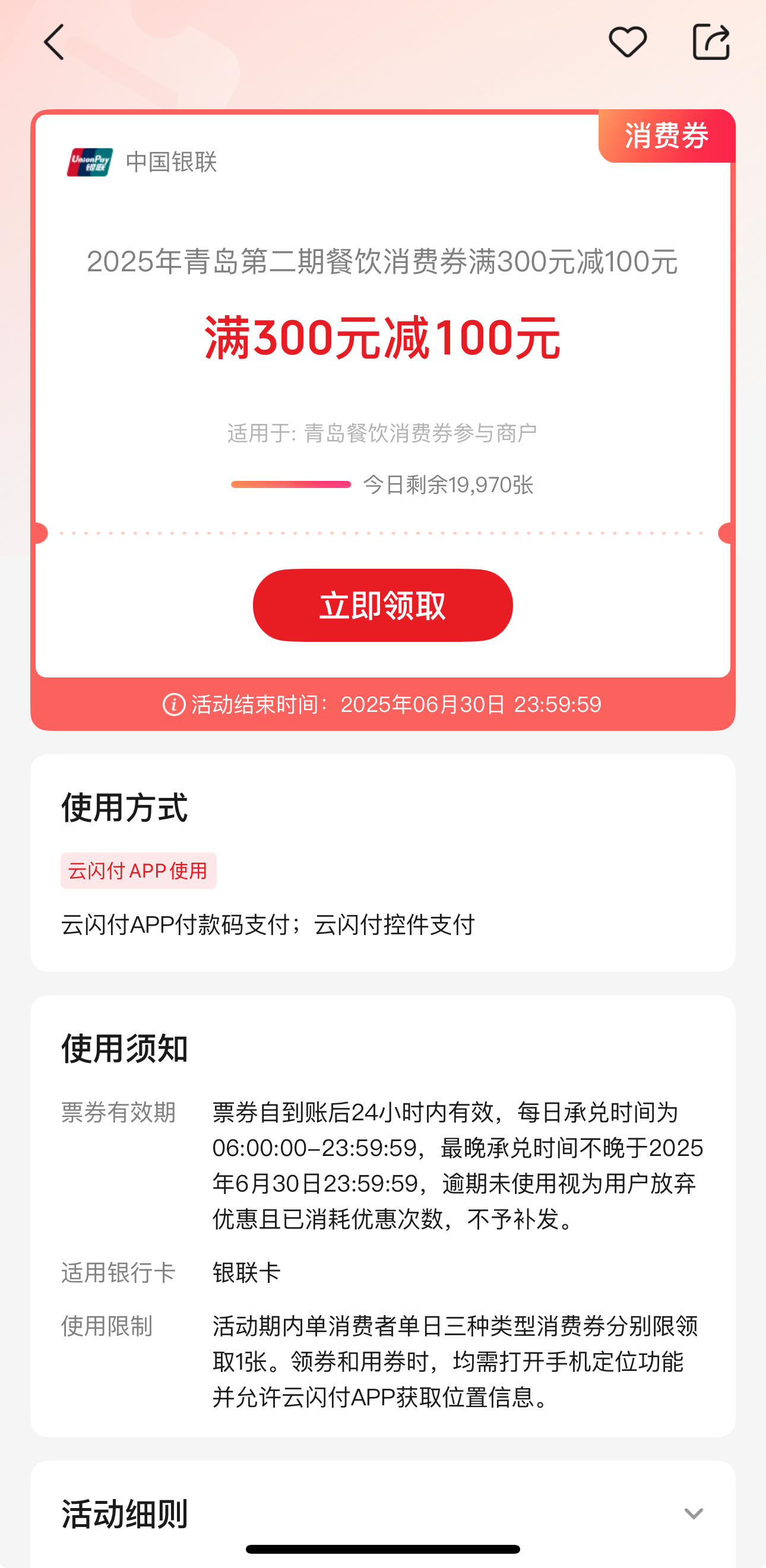 本次餐饮消费券活动于6月18日启动,将持续至6月30日,面额包括满“800元减200元”“300元减100元”“50元减20元”3种类别,每日上午10点通过中国银联云闪付APP集中发放,领取后24小时内有效。活动期间在青岛的市民、游客均可参与领券、用券。无论是想带家人吃自助,还是约三五好友聚会,或者是吃简餐喝咖啡,总有一款适合你!