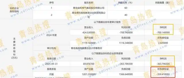 青岛青科益和职业技能培训学校有限公司,注册地位于黄岛区黄河中路388号,成立于2021年,法定代表人为尹瑞刚,属教育行业。其2024年度营业收入424.53万元,净利润为亏损700.14万元,资产总额1119.16,所有者权益仅2.82万元。而截至2025年5月31日其营业收入为69.876700,净利润为亏损363.706500万元,资产总额为1207.23万元,所有者权益为亏损359.41万元。