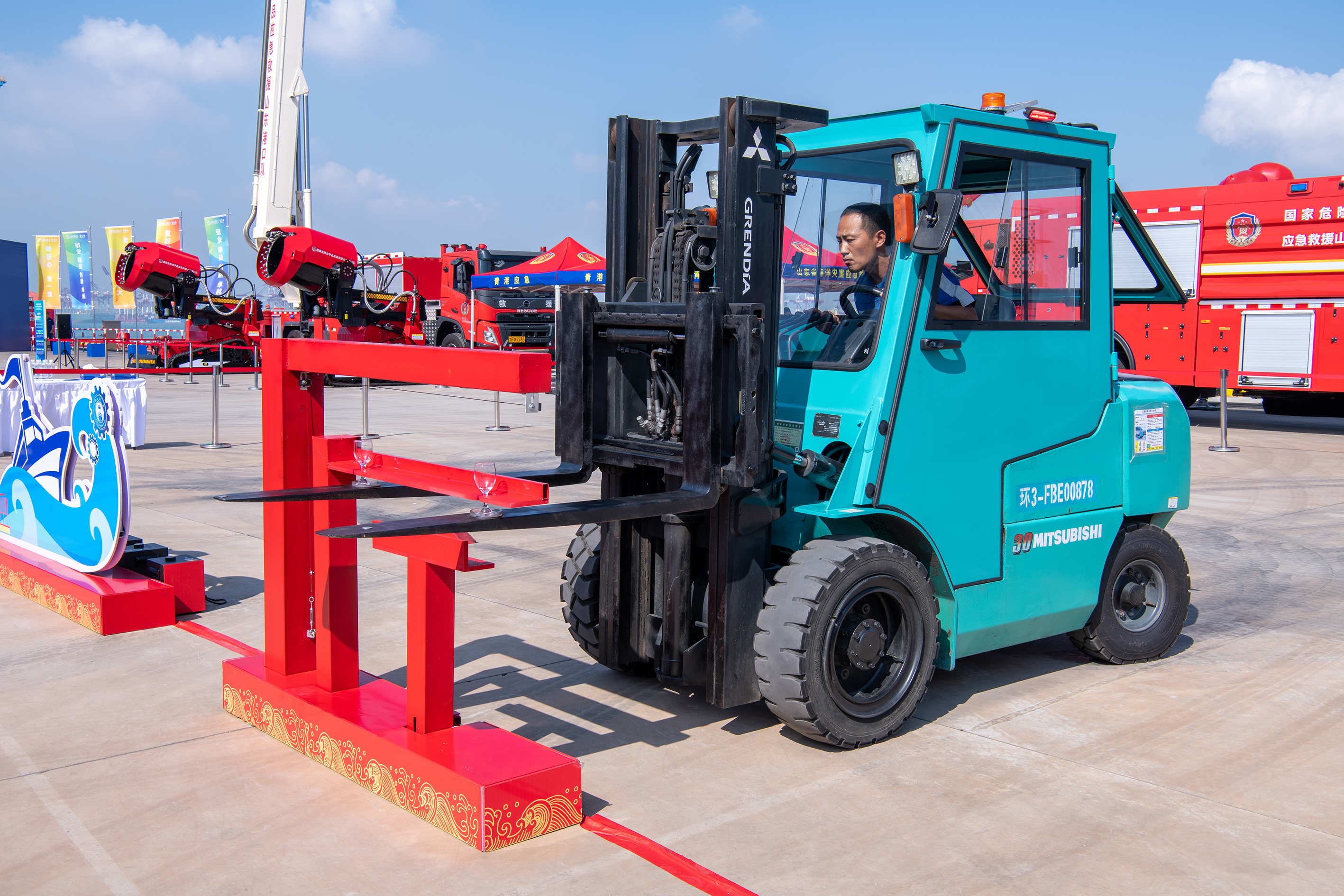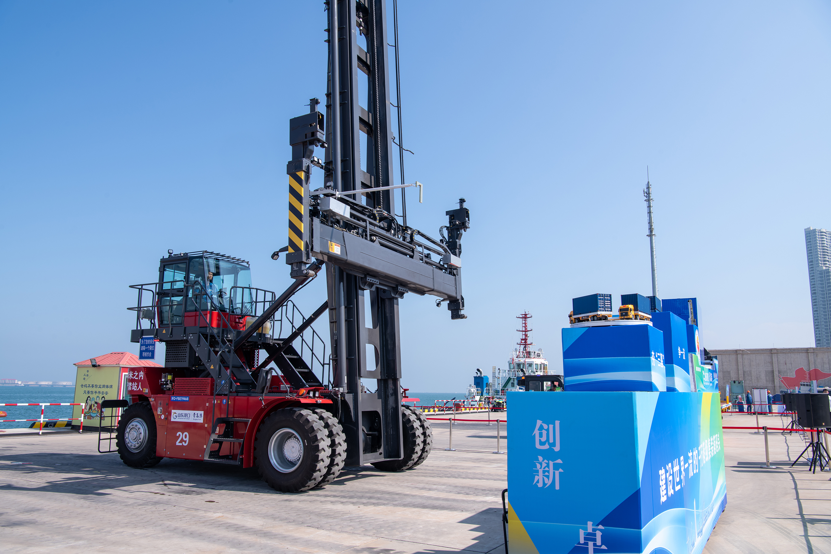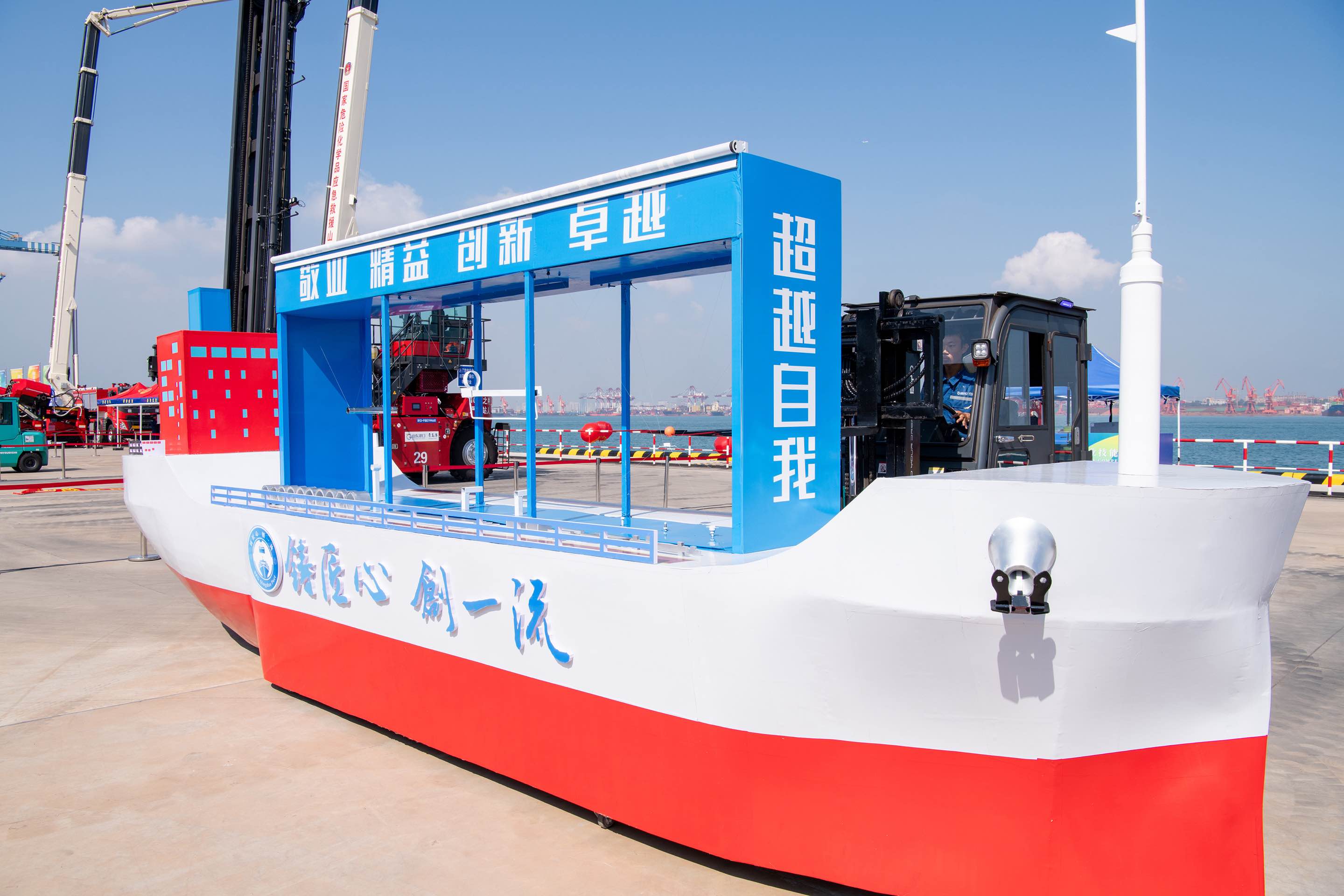 图为青岛港前湾联合集装箱码头公司的“攻坚冲锋”绝活表演