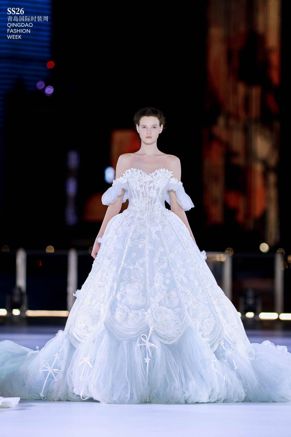 随后灯光转暖,音乐声如海浪深邃绵延,伴随着本届时装周无与伦比的开幕大秀震撼上演,2025中国(青岛)国际时装周的华彩大幕亦正式拉开!国际高级定制品牌The Atelier携The S/S26婚纱礼服系列“羽翼生花FLEURS CRUES PLUMES”惊艳亮相,全场聚焦。